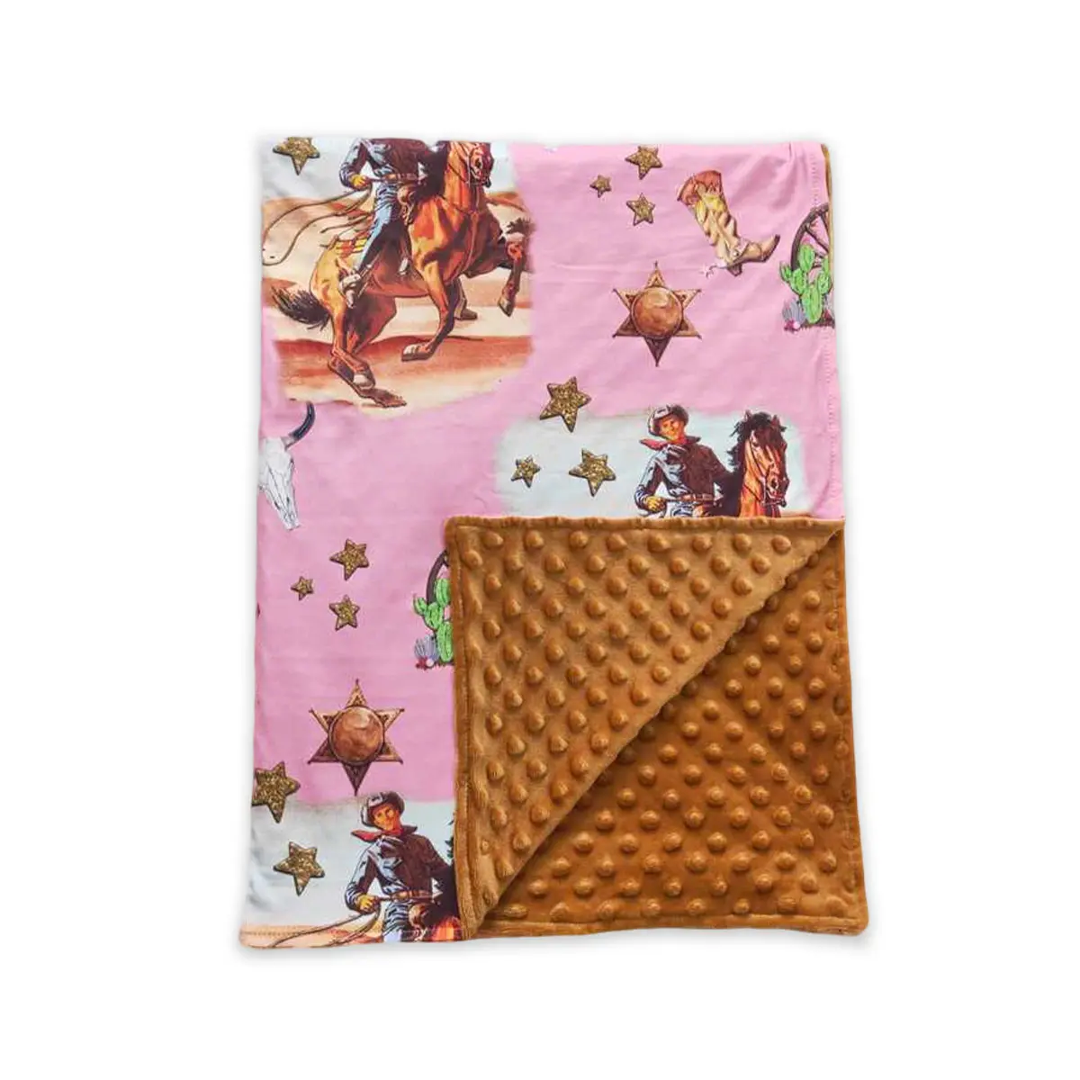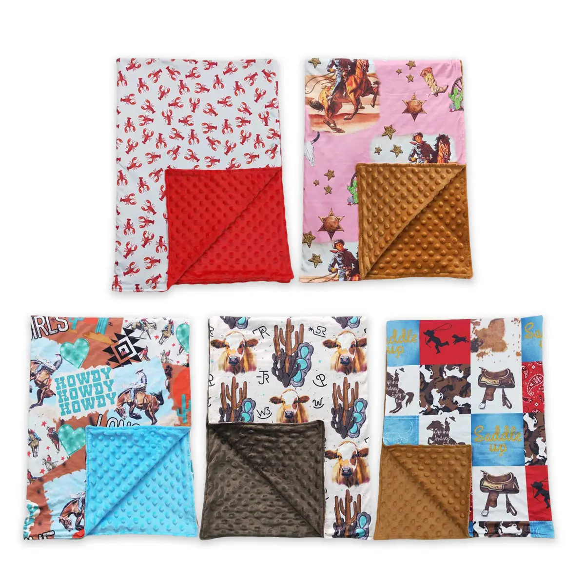 Our set features 5 exclusive, eye-catching designs centered around classic Western motifs—including rodeo cowboys, cacti, cowboy boots, horses, and retro ranch scenes. Paired with vibrant solid-color minky dot backings (red, brown, blue, black), these blankets stand out with bold, playful patterns that blend rustic Western charm with cute baby-friendly aesthetics, perfect for parents who love unique, themed baby gear.