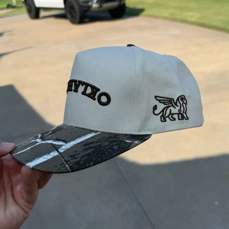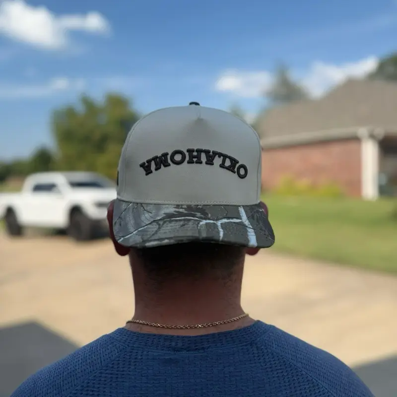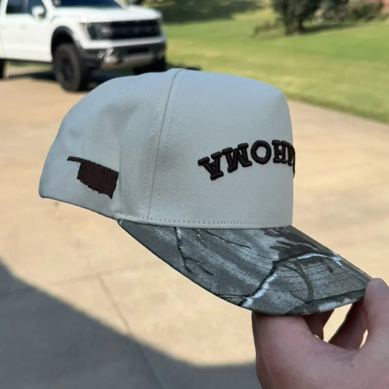 We cooked on this one. Oklahoma flipped upside down on the front, with Oklahoma and the Griffin Outfitters logo on the side.