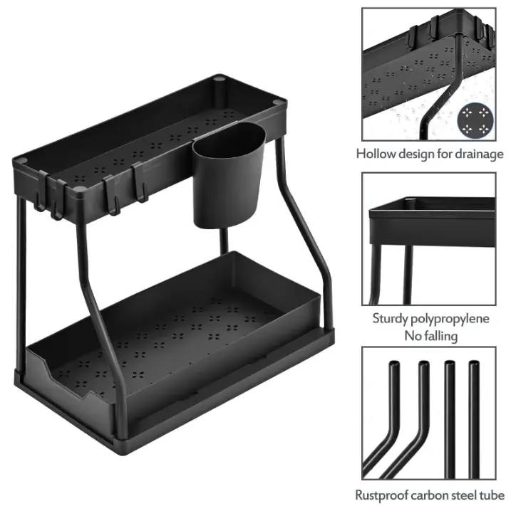 Under Sink 2-Tier Sliding Organizer with Frame Pull-Out Storage Basket Space-Saving for Kitchen Bathroom Laundry Room Sturdy Metal Frame Smooth Sliding Mechanism Adjustable Acrylic Straw Holder blade stand cork