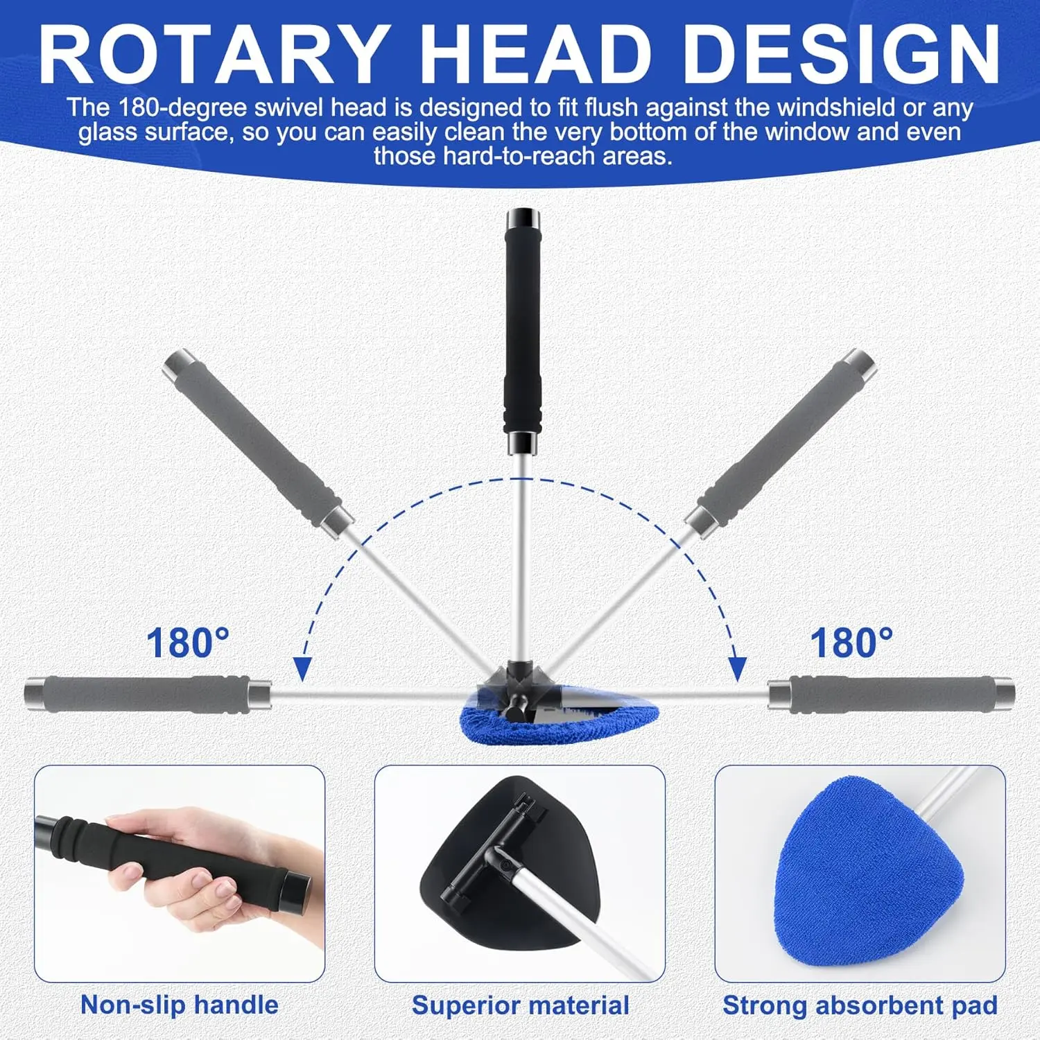 ✅ 180° Swivel Head Design:The 5.7"W × 5.2"L large head swivels for maximum glass contact. Its ergonomic handle allows you to clean inside and outside windshields easily without back strain.