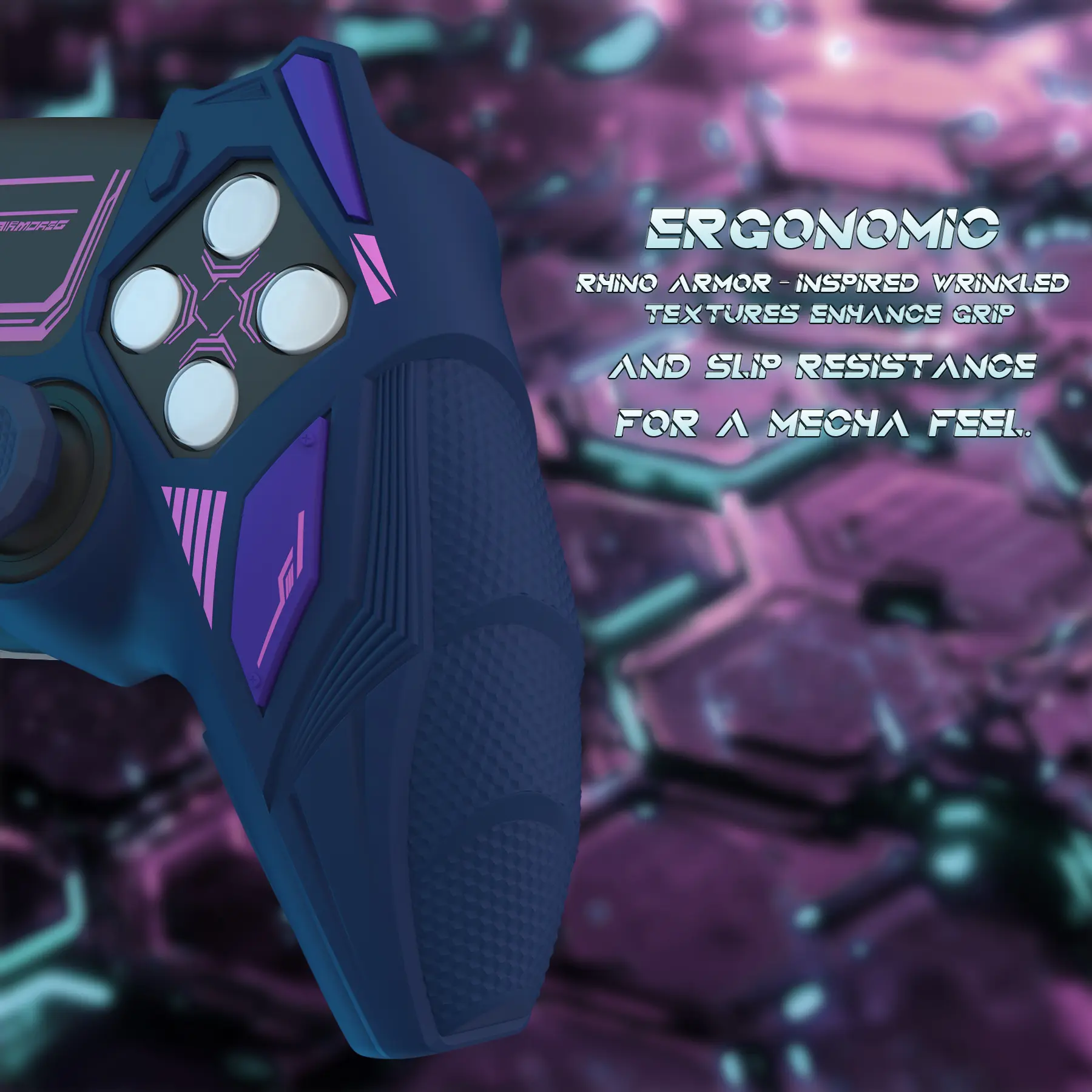 ·【Mecha Rhino Design – Bold & Futuristic】Inspired by armored sci-fi aesthetics, this controller skin for PS5 features sharp mech lines, a rhino horn top, and layered side textures for a rugged, tech-style appearance. Adds a bold new look and delivers an anti-slip grip for enhanced control—perfect for gamers