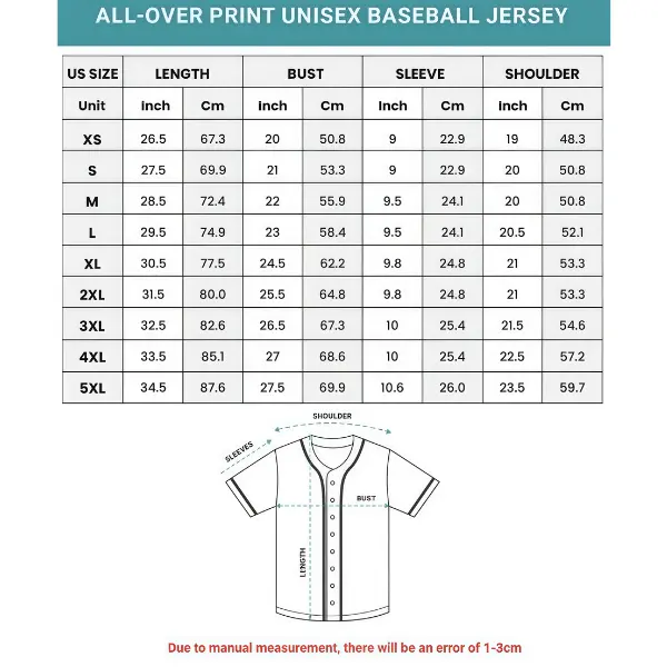 Bring the sporty energy to your everyday wear with our All-Over Print Baseball Jersey. Designed for both players, fans, and even athleisure fashion lovers, the jersey provides comfort, durability, and bold style. Customize it with your team colors, logo, or number and make a winning statement on and off the field.