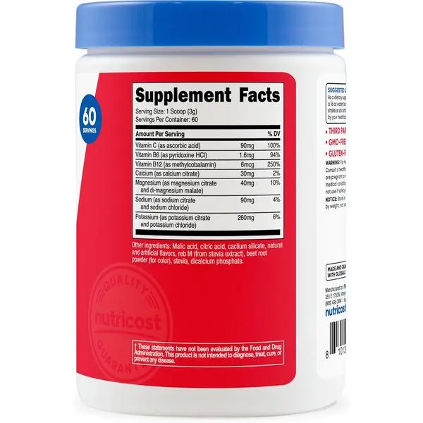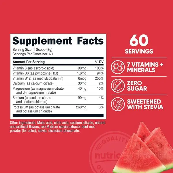 Vitamin C (as ascorbic acid),Vitamin B6 (as pyridoxine HCI),Vitamin B12 (as methylcobalamin),Calcium (as calcium citrate),Magnesium (as magnesium citrate and di-magnesium malate),Sodium (as sodium citrate and sodium chloride),Potassium (as potassium citrate and potassium chloride),Malic Acid,Citric Acid,Calcium silicate,Natural and Artificial Flavors,Reb M (from stevia extract),Beet root powder (for color),Stevia,Dicalcium Phosphate