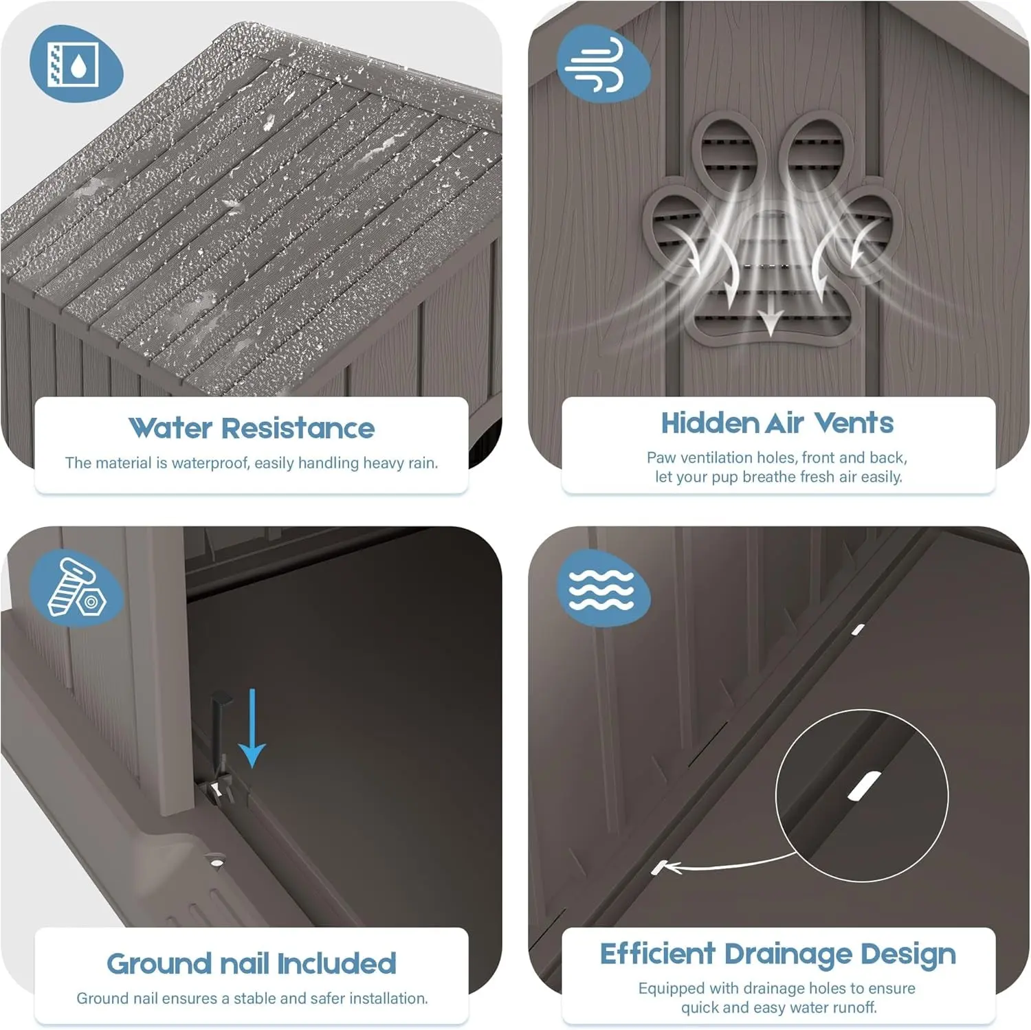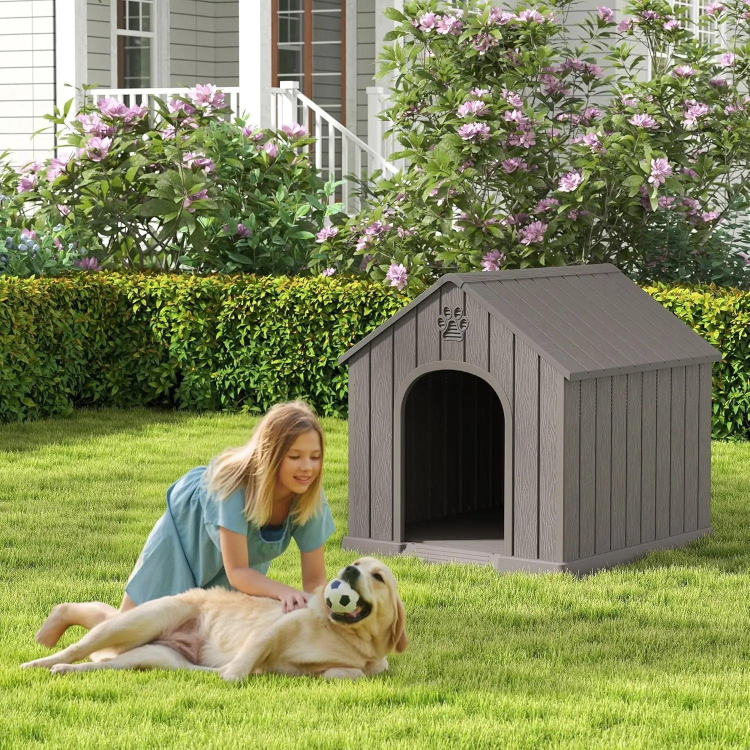 Large Dog House Outdoor Indoor for Medium Large Dogs, Sturdy Plastic Waterproof Doghouse with Air Vents and Elevated Floor, Easy Clean and Assemble