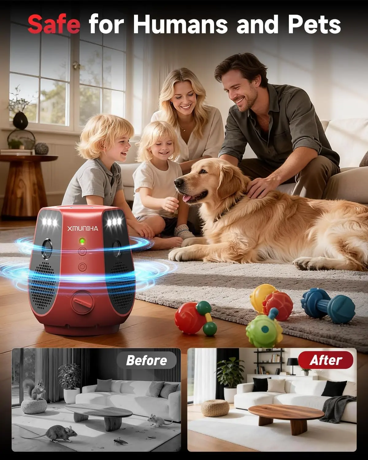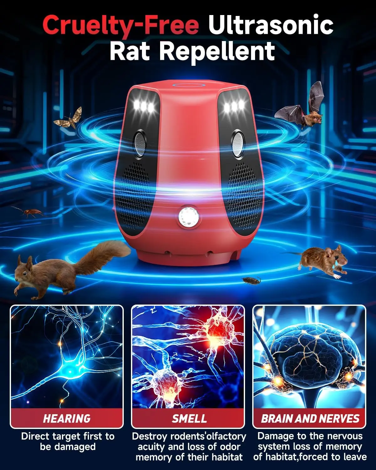 ·Safe for humans & Easy to use: This rodent repellent ultrasonic plug in repels mice using the sound waves, without worrying about causing harm to your family and pets. No complicated operation required, plug and play, helping you stay away from rats and insect pests. It's easy to install, requires no cleanup, and effectively repels rodents without disturbing people or pets, making it an ideal partner for safe and user-friendly indoor rodent control