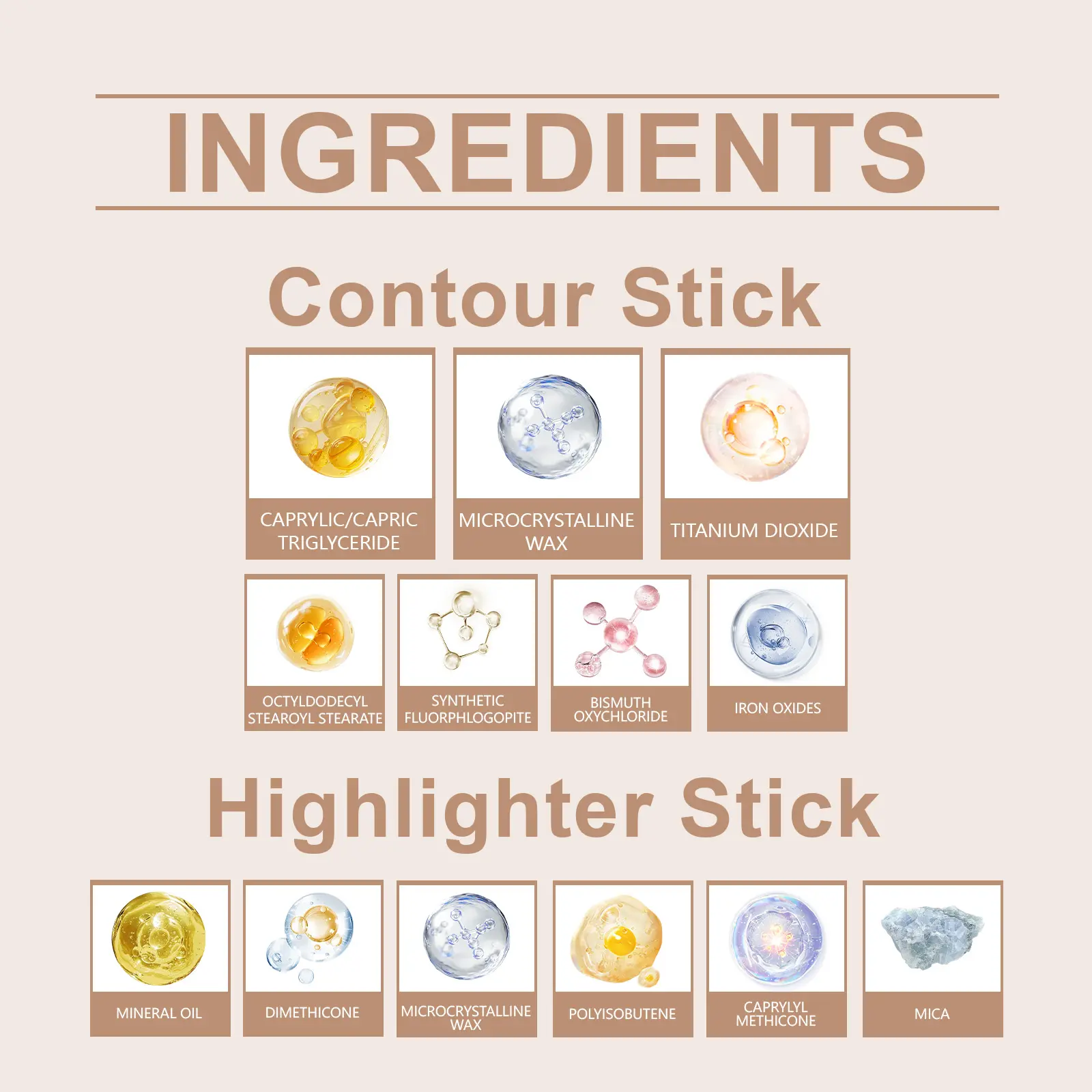 Our Natural + Light Brown 2-in-1 Contour and Highlight Stick is meticulously formulated with the following ingredients: Highlight Stick: Mineral Oil, Dimethicone; Contour Stick: Caprylic/Capric Triglyceride, Microcrystalline Wax. It is designed for effortlessly sculpting three-dimensional contours. The application is extremely convenient: For contouring: Gently apply along the hairline, under the cheekbones, on both sides of the nose, and along the jawline. Use your fingers or makeup tools to gently pat and blend for a natural contouring effect. For highlighting: Suitable for the center of the forehead, the bridge of the nose, the brow bone, the apple cheeks, the chin, and other areas that need highlighting. Blend the edges gently to make the highlight naturally merge with the base makeup. You can achieve both coloring and highlighting with just one stroke, eliminating the need to carry multiple pens when you're on the go. It clearly creates facial contours and enhances the overall three-dimensional appearance