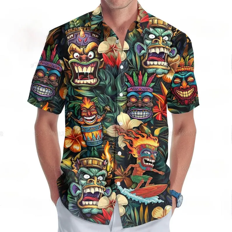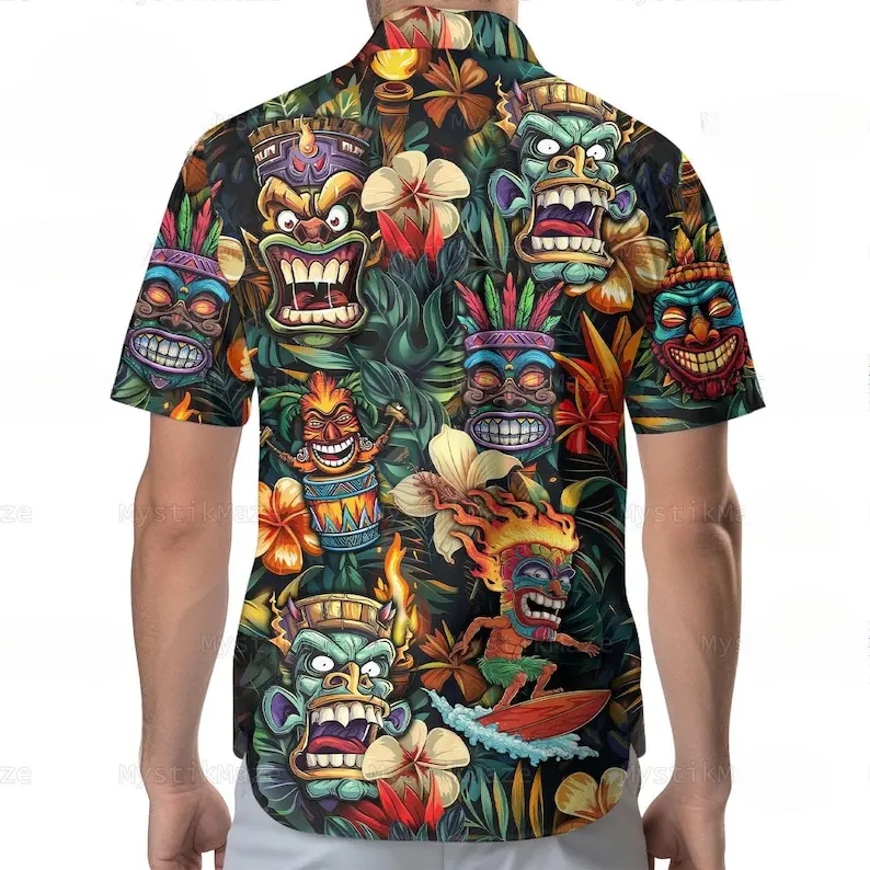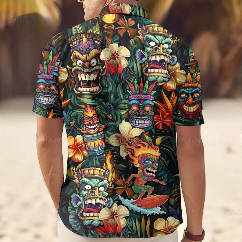 Hawai shirts Tiki Button Shirt features a vibrant tropical style, perfect for a lively summer.