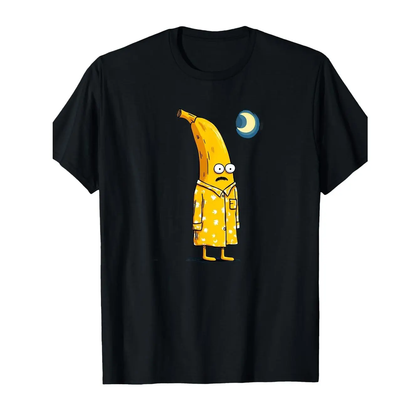 Women's funny banana character in pajamas Graphic T-Shirt - Short Sleeve Crew Neck Regular Fit Casual Wear | Soft & Breathable Fabric, Durable Print, Everyday Comfort, Machine Washable, cartoon humorous illustration of a banana wearing yellow pajamas with