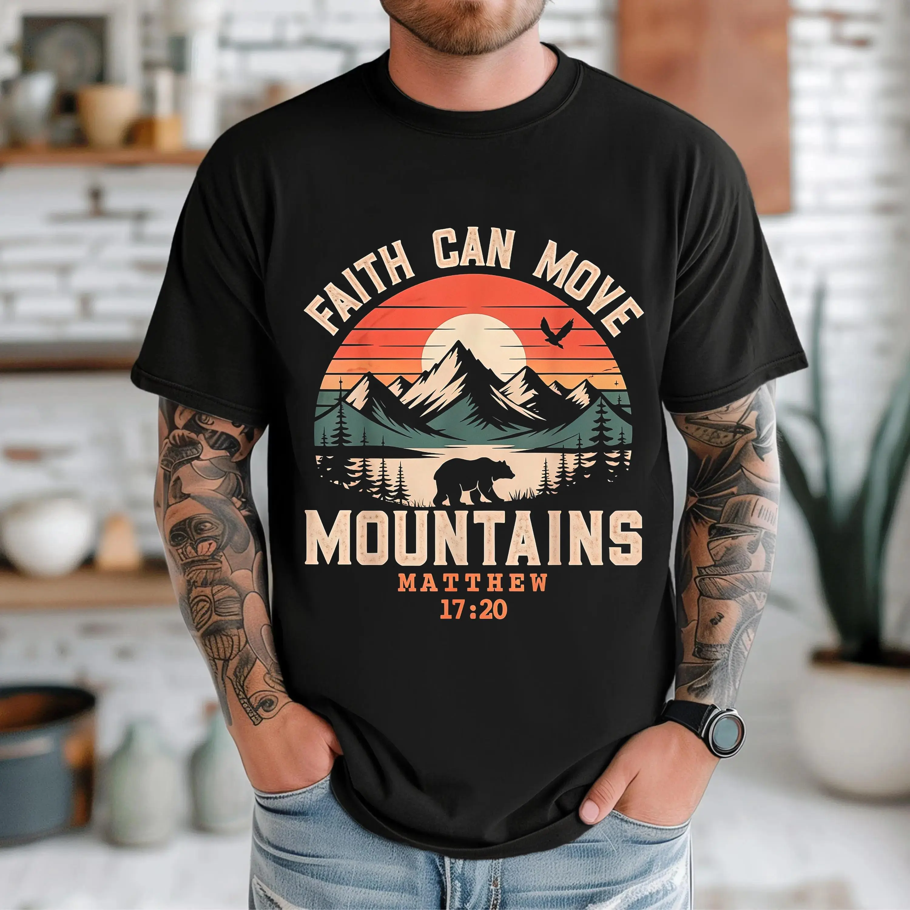 5. Faith Can Move Mountains Retro Sunset Bible Verse Christian T-Shirt