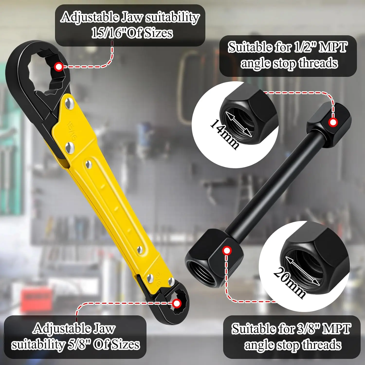 ·Angle On Wrench: Suitable for 3/8" or 1/2" MPT angle stop threads.
