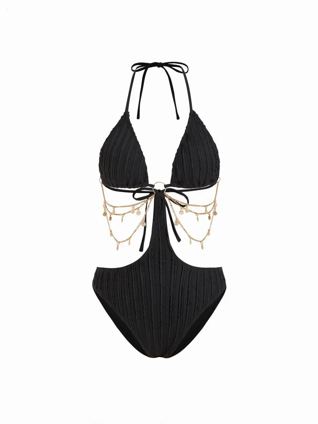 Shaping Lettuce Trim Cut Out Shell Chain O-Ring One Piece Swimsuit