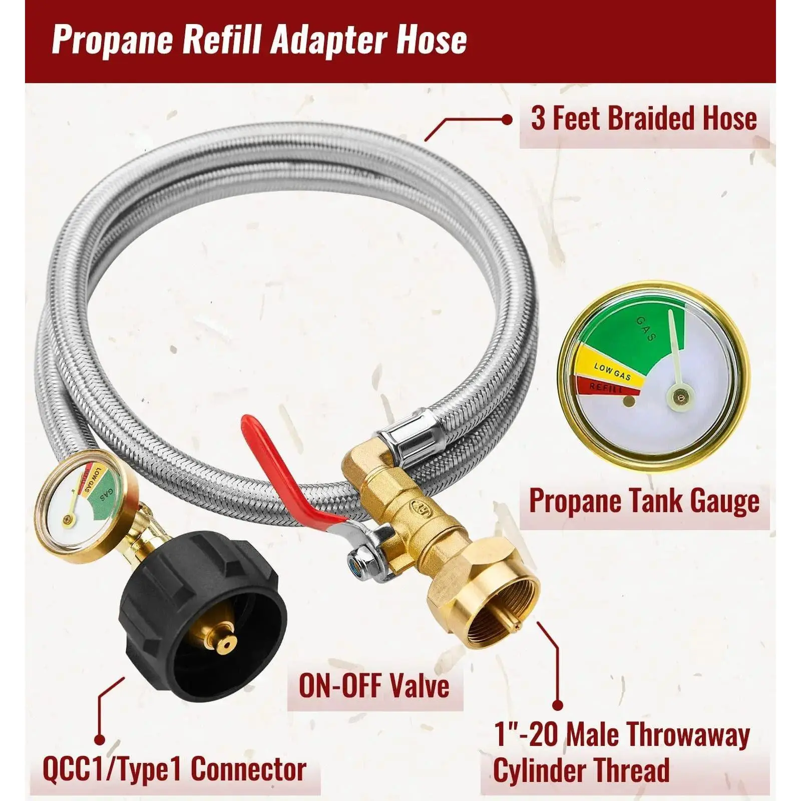 Propane Refill Adapter Hose | 3ft Stainless Steel with Pressure Gauge & Shut-Off Valve | Safe Fill for 1lb & 20lb Tanks | Camping, Grill & Outdoor Use
