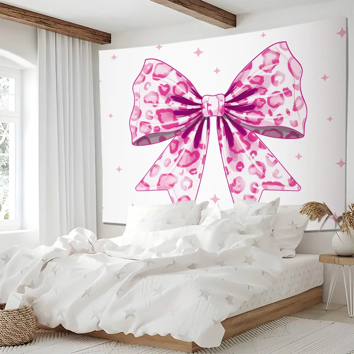Pink Leopard Bow Tapestry, Cute Y2K Wall Hanging, Aesthetic Tapestries, Soft Wall Blanket, Girly Backdrop Decor for Girls Bedroom & Dorm Room