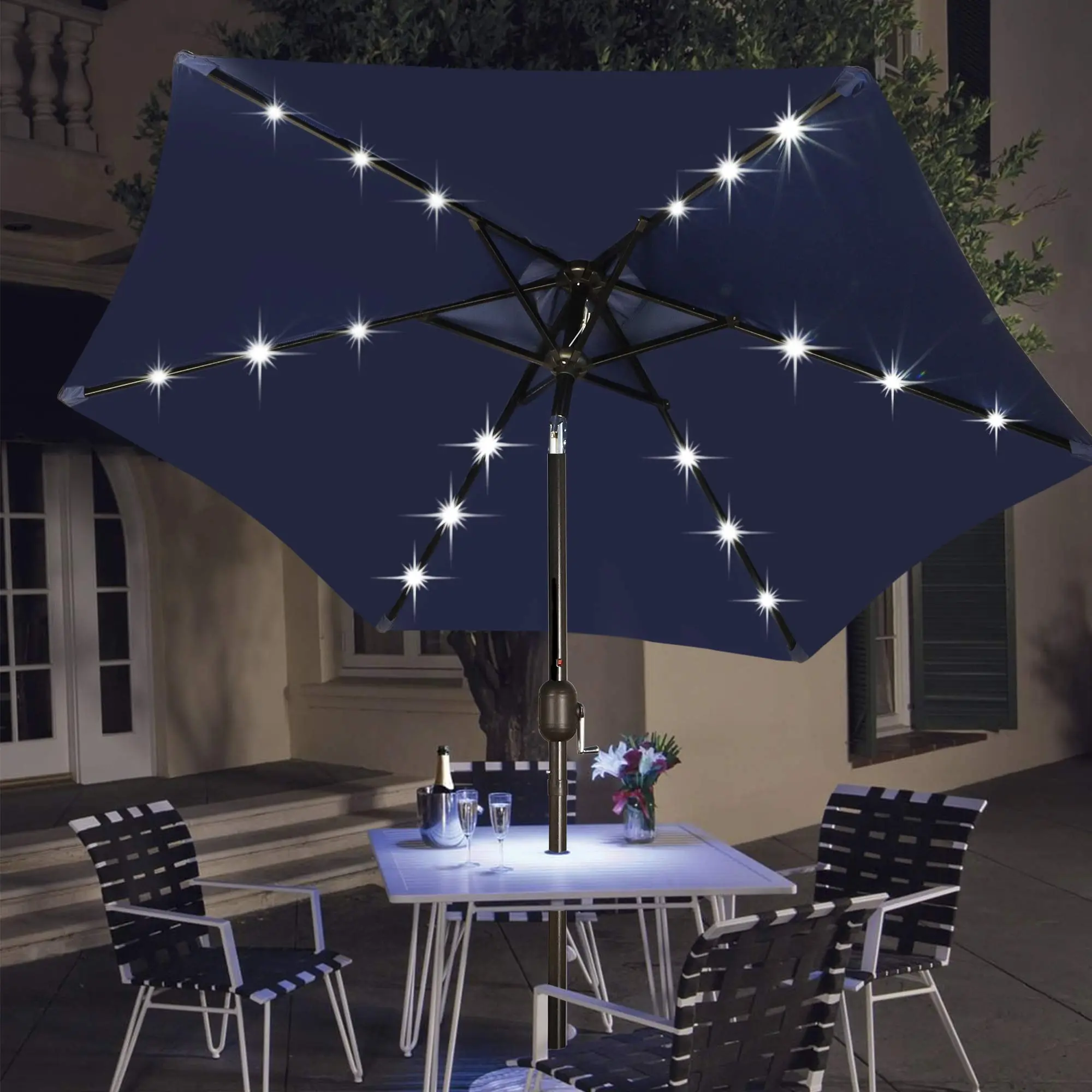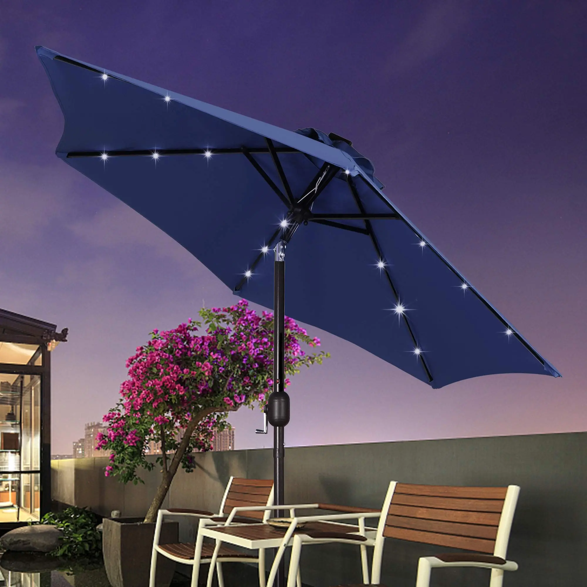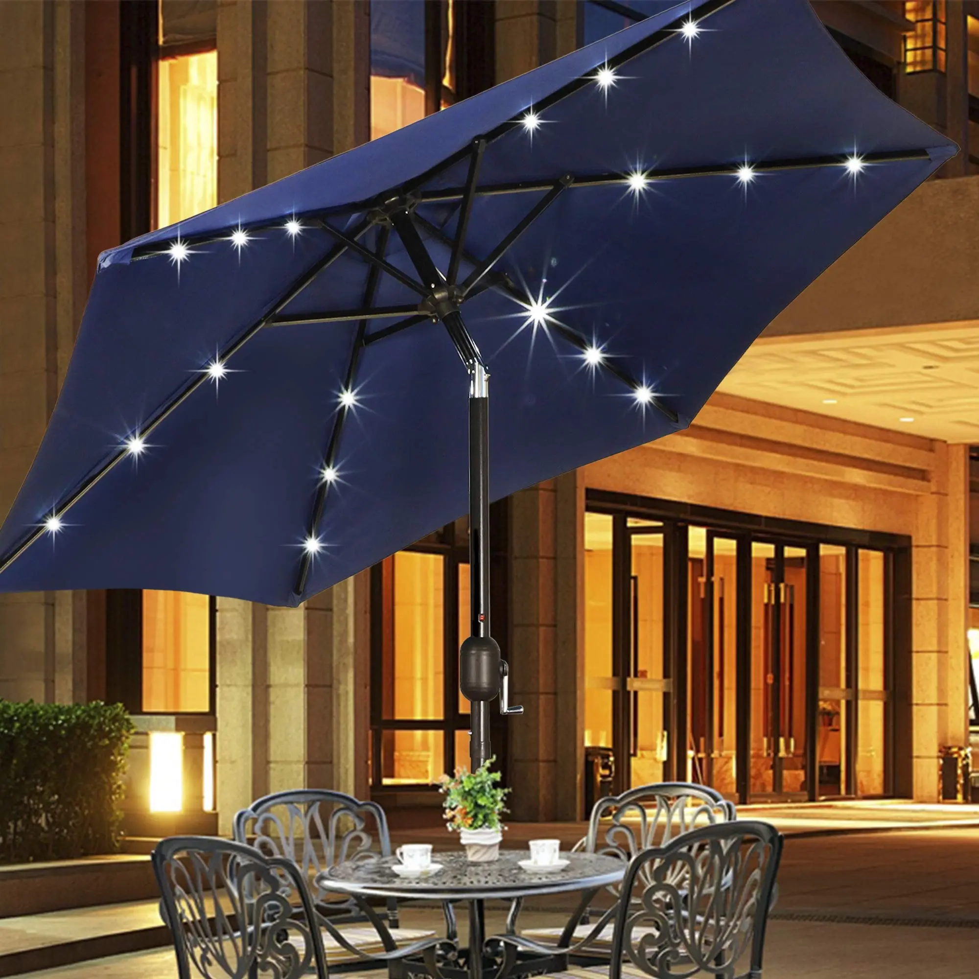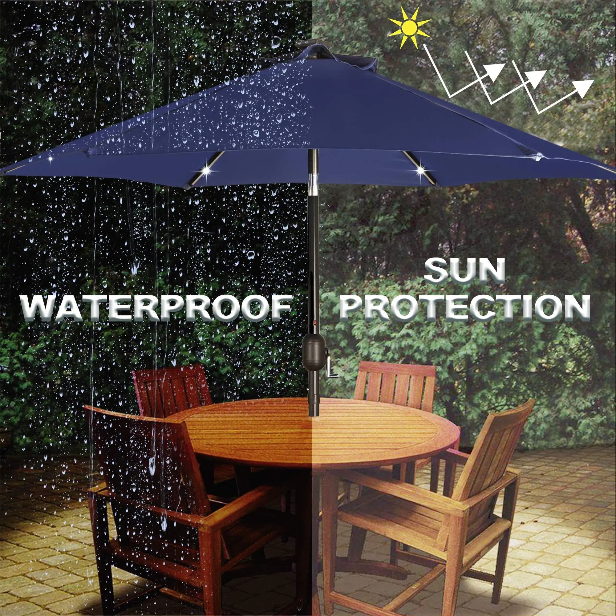 4 lights on each rib of patio umbrellas, 8 iron ribs construction, solar-powered 32 lights provides energy-efficient lighting, help to light up relaxing night and create warm atmosphere. Energy efficient and convenient