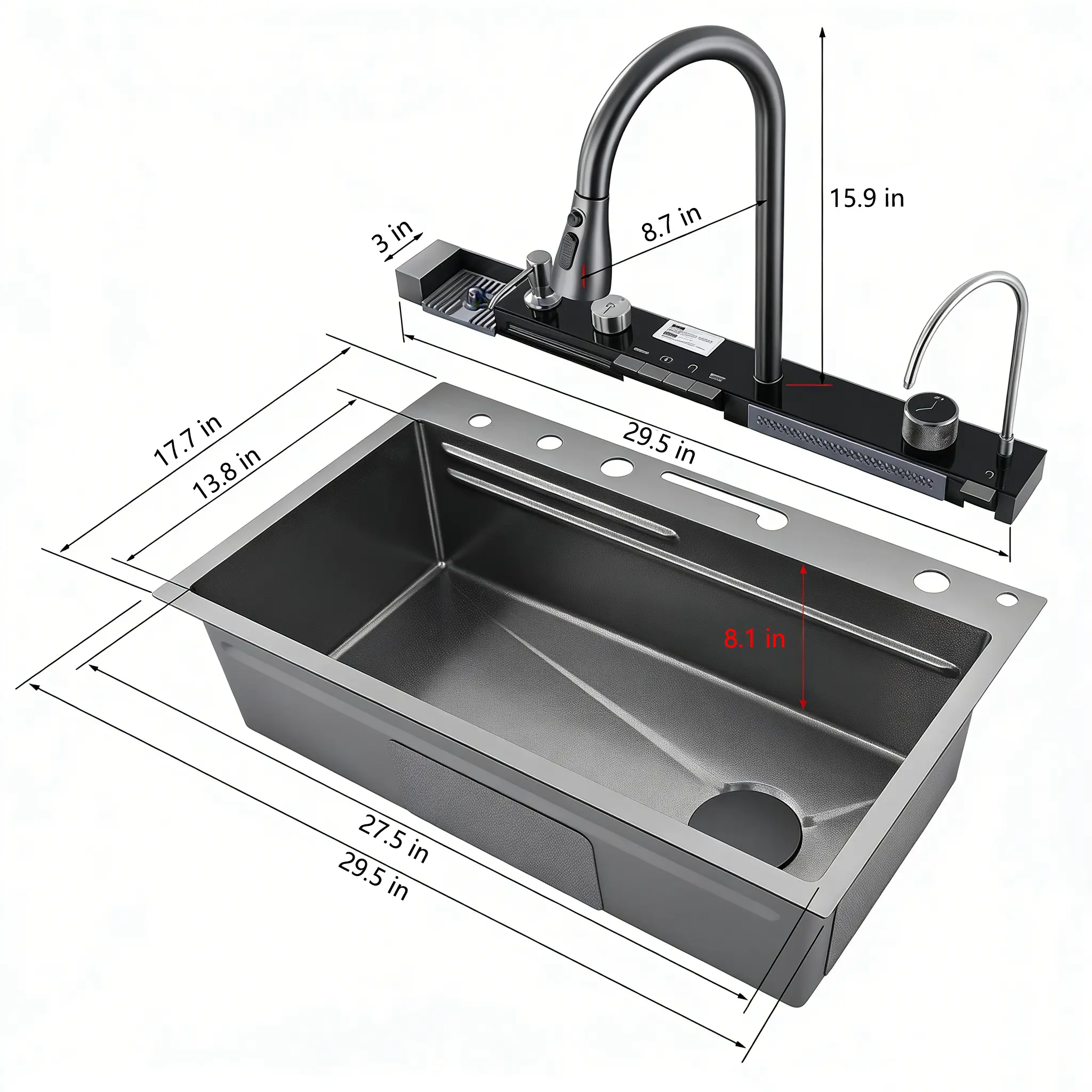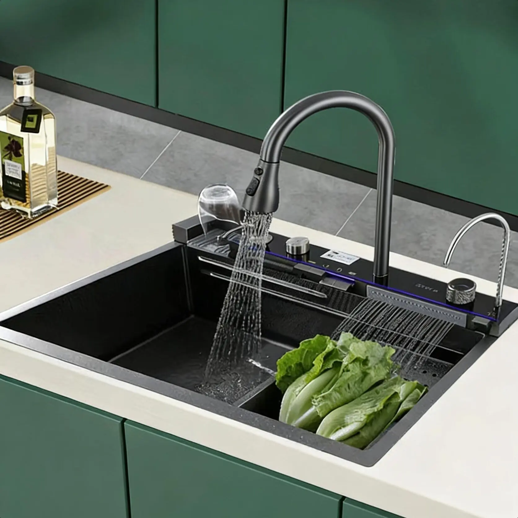 This 30 Inch smart kitchen sink is equipped with a clear digital display that shows real-time water temperature and working status, allowing you to monitor water conditions at a glance while cleaning. The innovative piano key control design provides independent and precise operation for different water functions, making daily kitchen cleaning more intuitive and efficient. No complicated buttons or confusing panels—just simple, one-press control for a smarter kitchen experience.