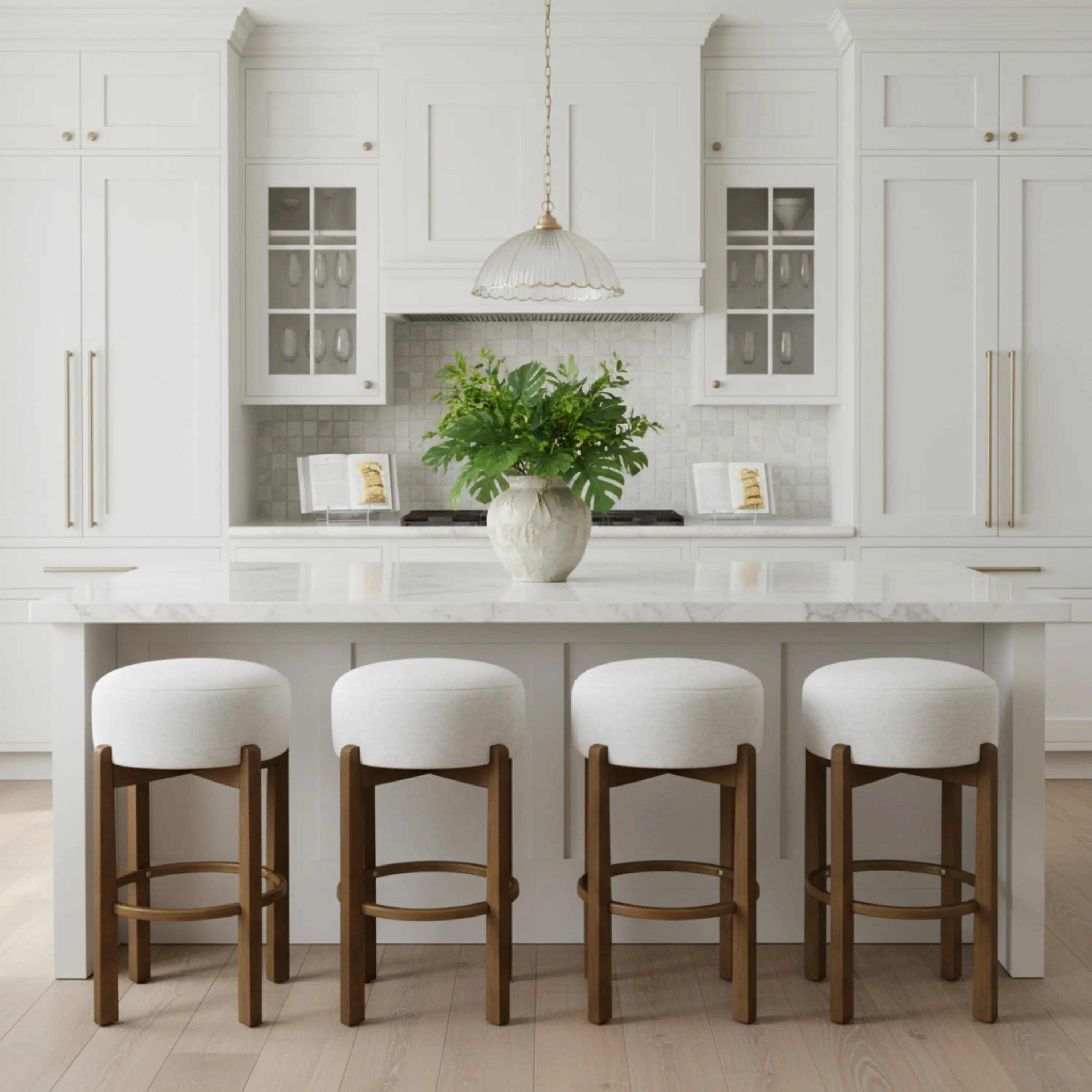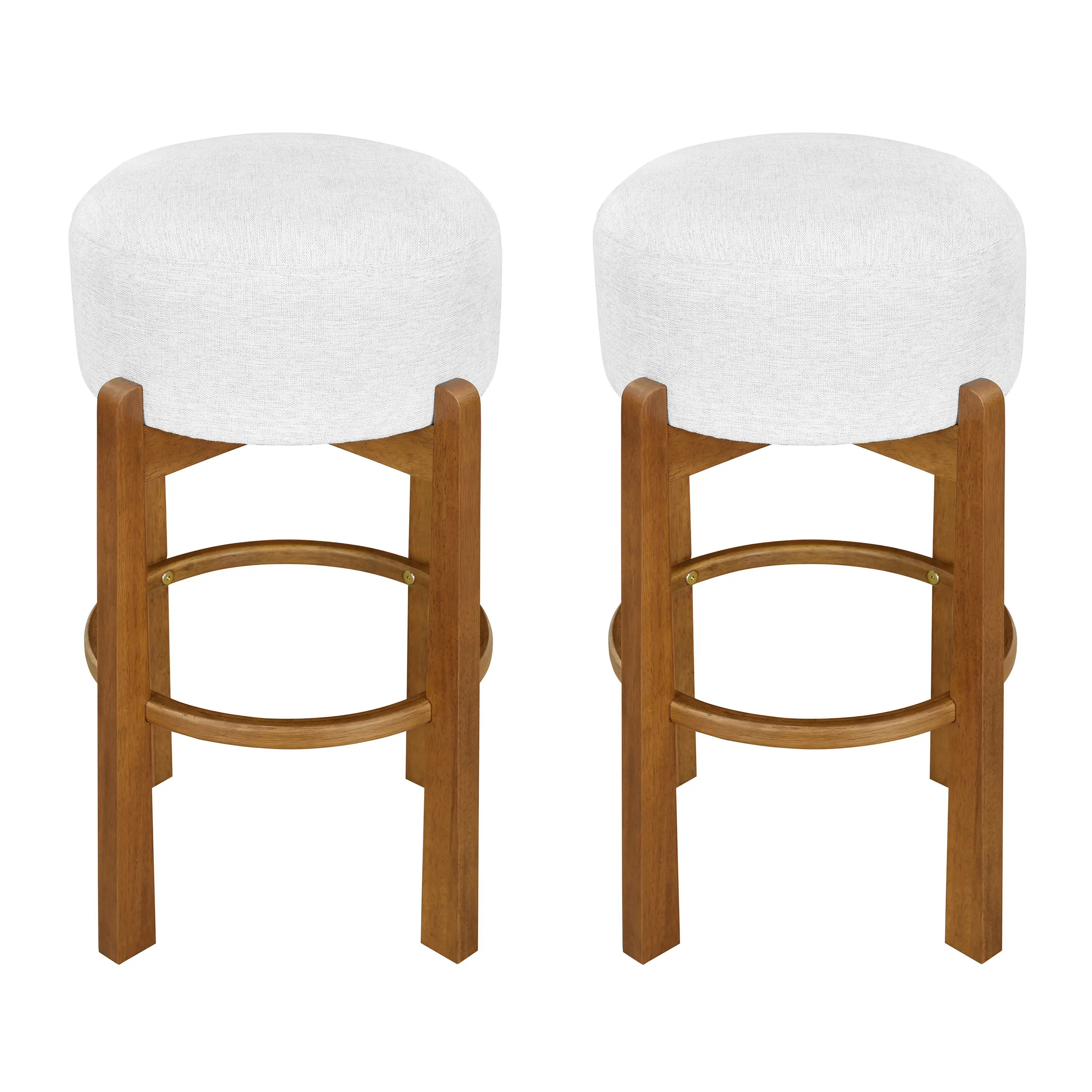 ·Rustic Backless Bar Stools: A Fusion of Modern Round Farmhouse Style and Practical Elegance The round seat, upholstered in linen and paired with solid wood legs , marries modern minimalism with farmhouse allure. Its streamlined silhouette exudes contemporary style, while the wood-gold contrast suits modern farmhouses and kitchen islands. Built for durability, it offers reliable seating; the footrest stabilizes and supports, preventing foot fatigue. This versatile piece fits seamlessly into kitchens, bars, and dining rooms. The backless, rounded seat design is a testament to spatial intelligence. When not in use, it can be easily tucked under the kitchen island or breakfast bar, neatly stowed beneath any high table or countertop. This not only frees up floor space but also keeps the living area tidy, achieving a perfect balance between functionality and aesthetic design within limited space.