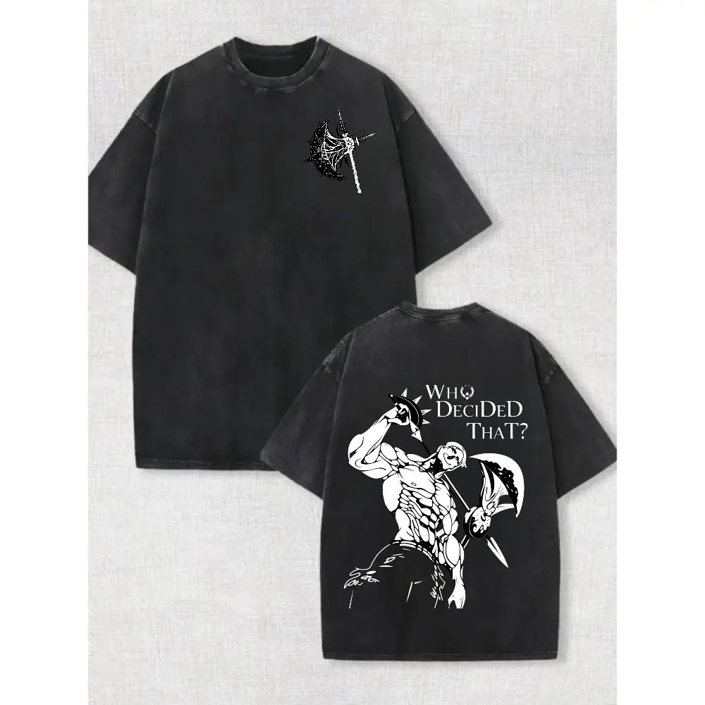 Vintage Washed Escanor Seven Deadly Sins Anime Graphic T-Shirt Distressed "Who Decided That?" Escanor Oversized Streetwear Cotton Tee Retro Anime The Seven Deadly Sins Escanor Pride Casual Graphic Shirt