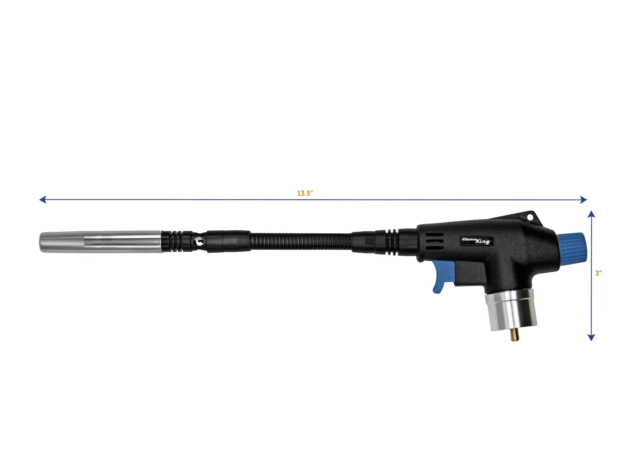 The Flame King FK-FM-6007CGA Twist Torch produces a high-intensity ULTRA SWIRL FLAME perfect for metal works, brazing copper and steel, basic plumbing repairs, soldering, woodworking, lighting grills, thawing frozen pipes and locks, searing meat, caramelizing sugar, and any general DIY heat applications. It is pressure-regulated for consistent performance when tilted. Its durable flexible neck makes it BENDABLE giving you a huge advantage when aiming for convenience while torching. Very easy and simple to use with the instant on/off ignition that automatically ignites the flame and extinguishes when finished. Its ergonomically designed grip provides comfortable and controlled use. The stainless steel burn tube, cast aluminum body, and brass burn tip were constructed for safety, durability, and performance. Secure CGA600 connection fits perfectly with the Flame King's 1/4LB, 1/2LB and 1LB Propane Cylinders (sold separately). This torch also works with other popular fuel gases - standard 1lb Propane cylinders, MAPP, and MAP-PRO; 1 Year Manufacturer's Defect Warranty