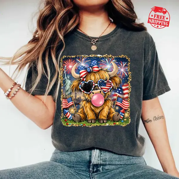 [Sale up to 50%] [Free Ship] Hand Drawn 4th of July Highland Cow T-Shirt, Leopard 250th Anniversary Shirt, Western 4th of July Tshirt, American Flag