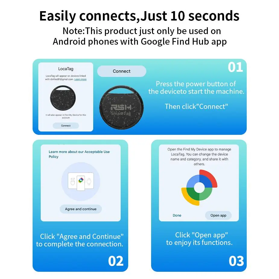 Easy Connction and Data security: Simply turn on the android Bluetooth tag and put it near your android phone, a pairing window will then automatically pop up. The Google find My network isencrypted and anonymous. The location data and history of your belongings are not stored and cannot be known by Google systems, ensuring your data security