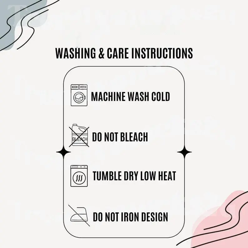 • Do not bleach, dry clean, or iron directly on the design.