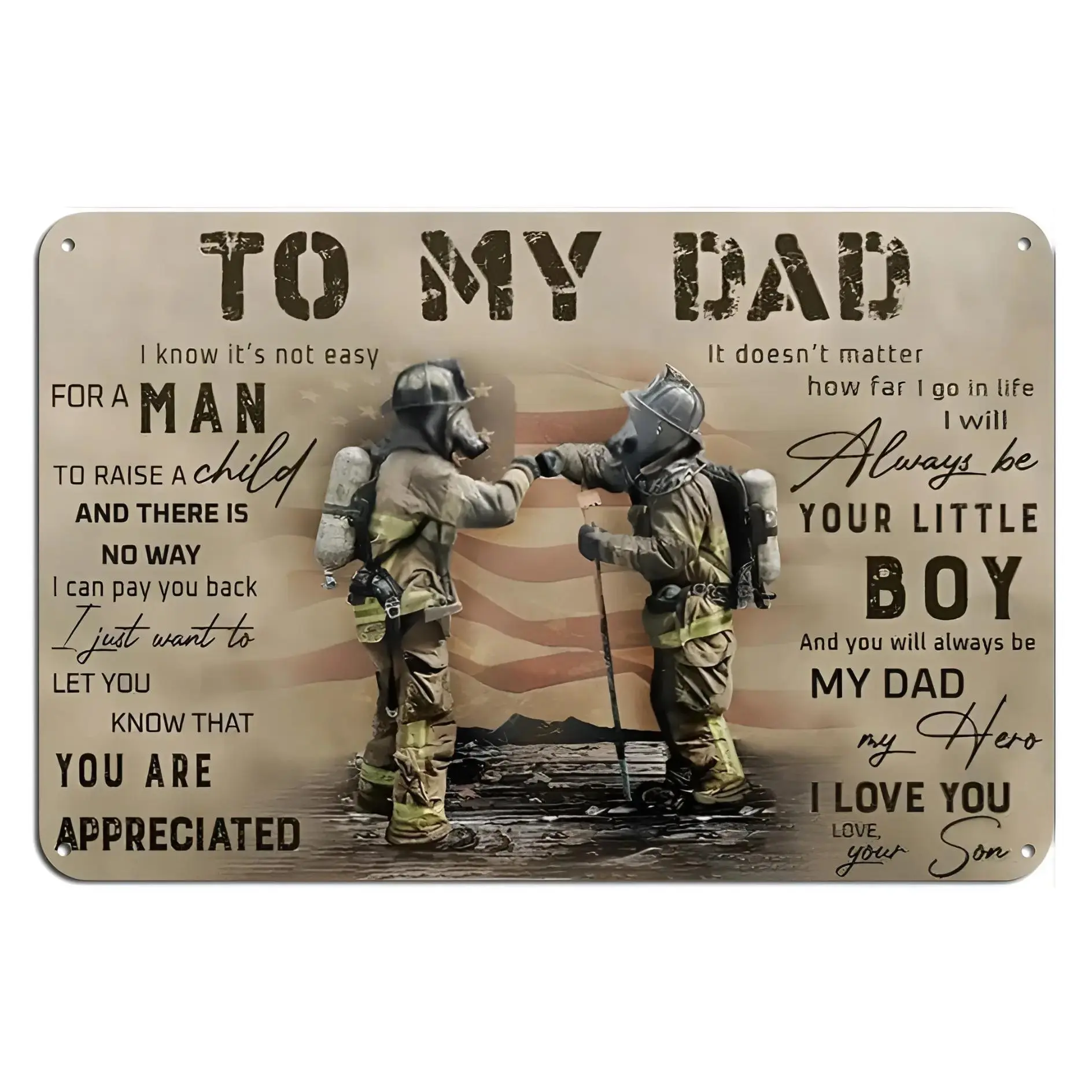 This unique tin sign celebrates the bond between a firefighter and his dad.Perfect for home, cafes, pubs, or clubs, it adds a touch of humor and nostalgia.The sign measures 12 x 8 inches, making it a fitting gift.🎁