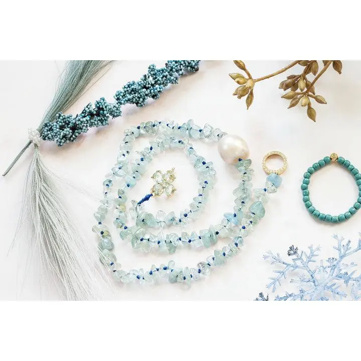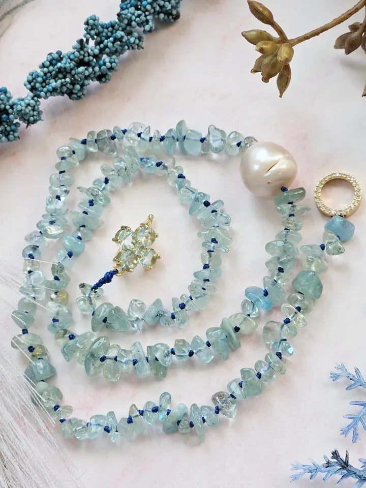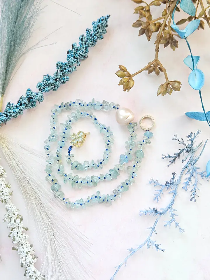 This necklace brings together calming aquamarine tones and the warm glow of a pink pearl, creating a versatile piece that transitions effortlessly from casual to elevated styling.