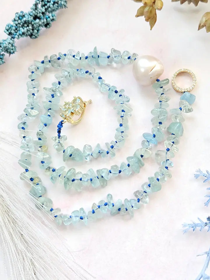 Elevate your everyday look with this handcrafted aquamarine chip necklace, featuring a luminous Edison pink pearl centerpiece.
