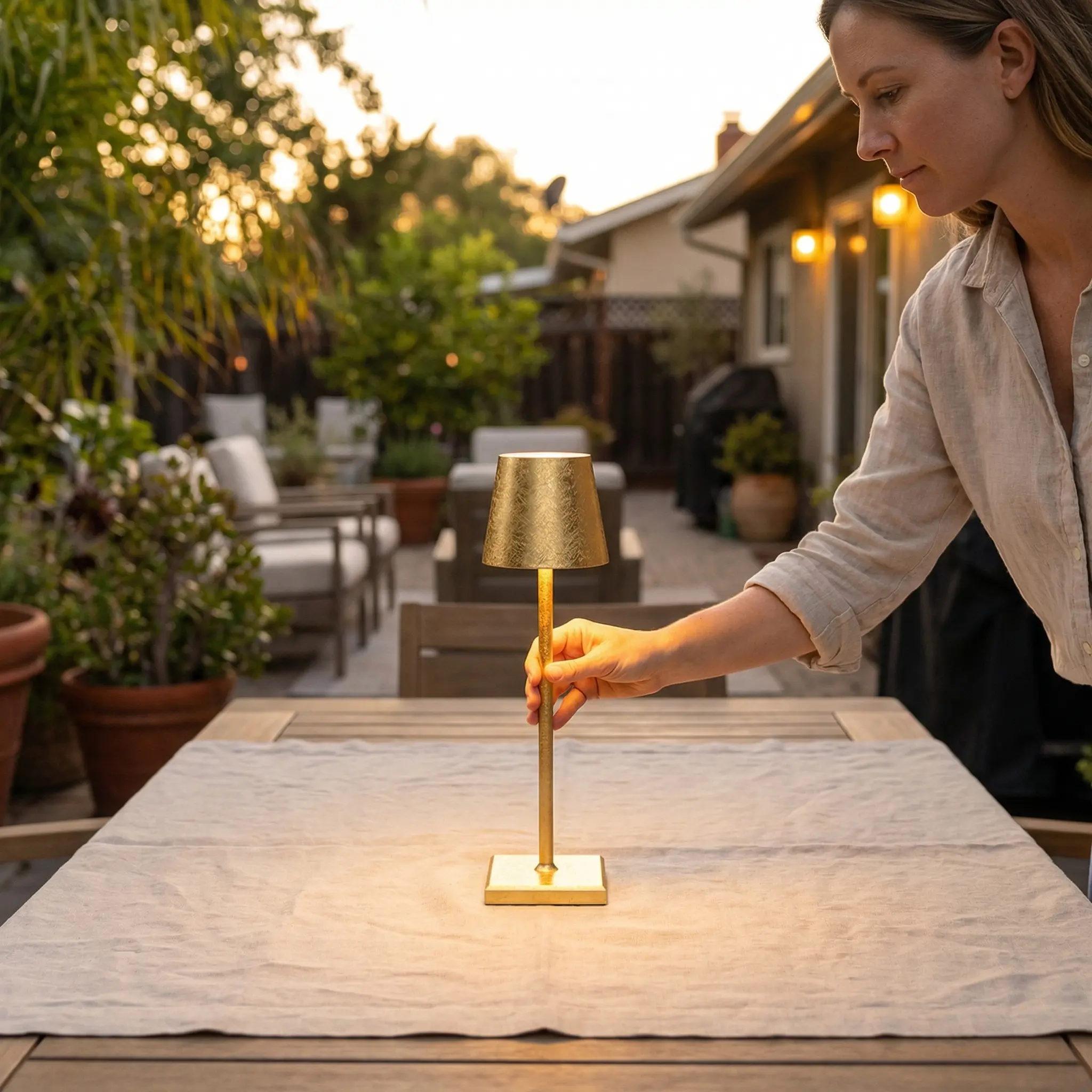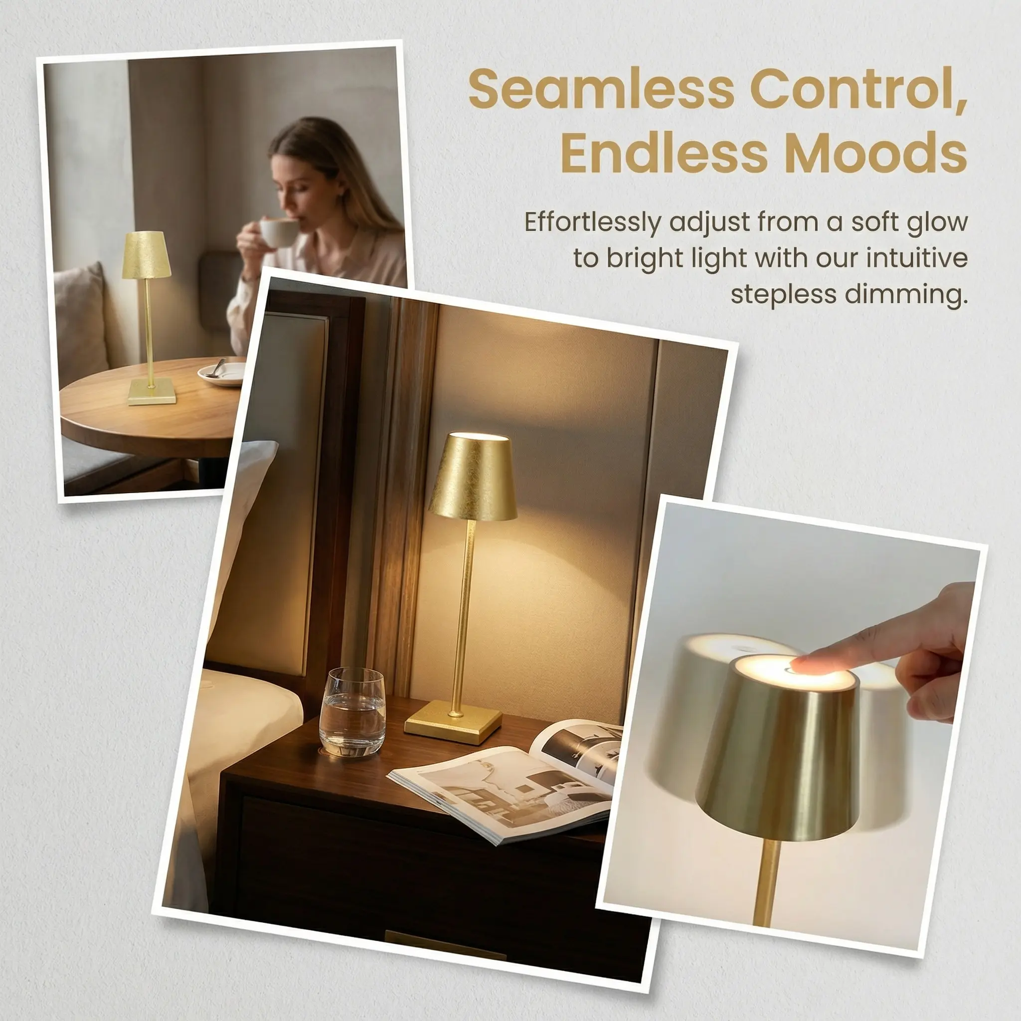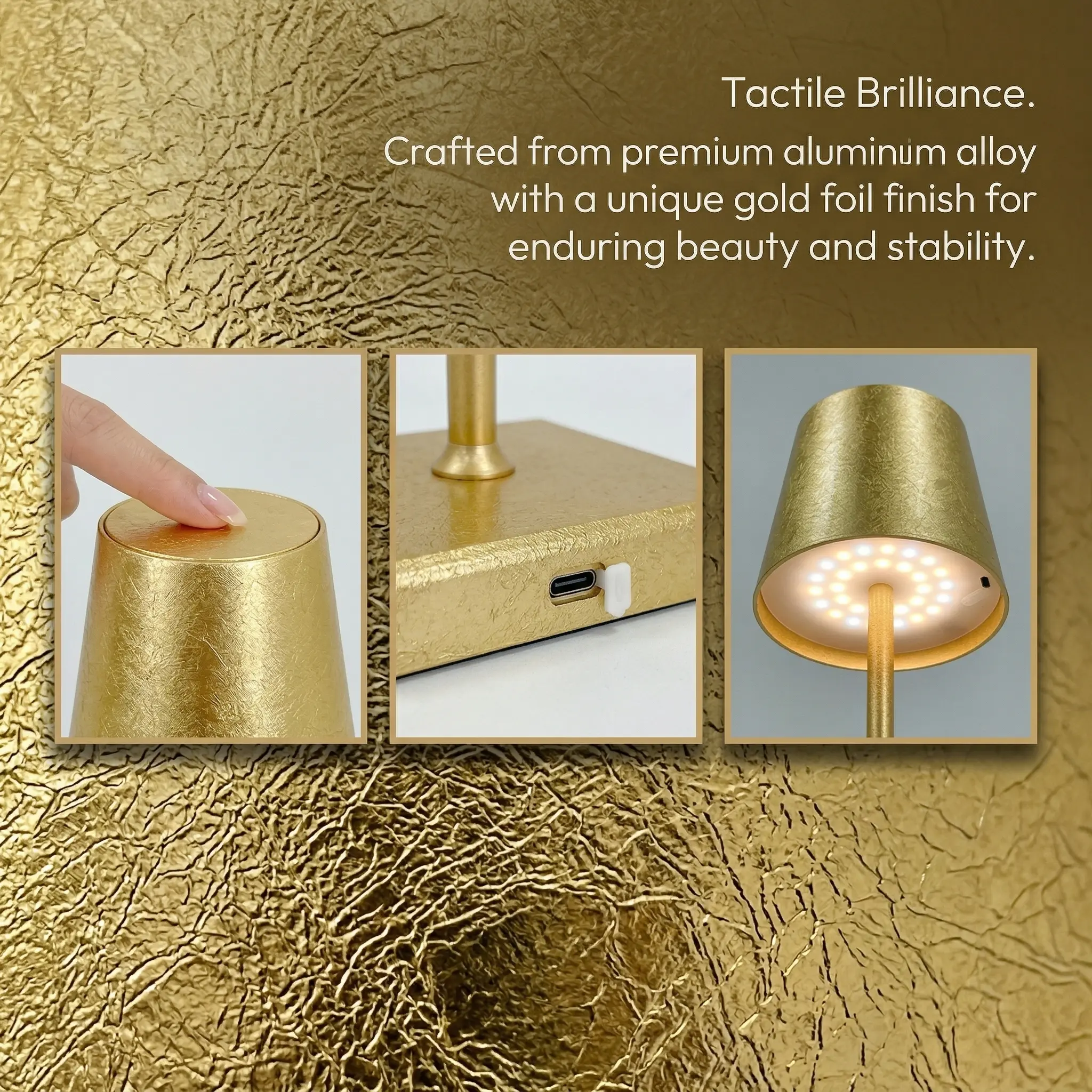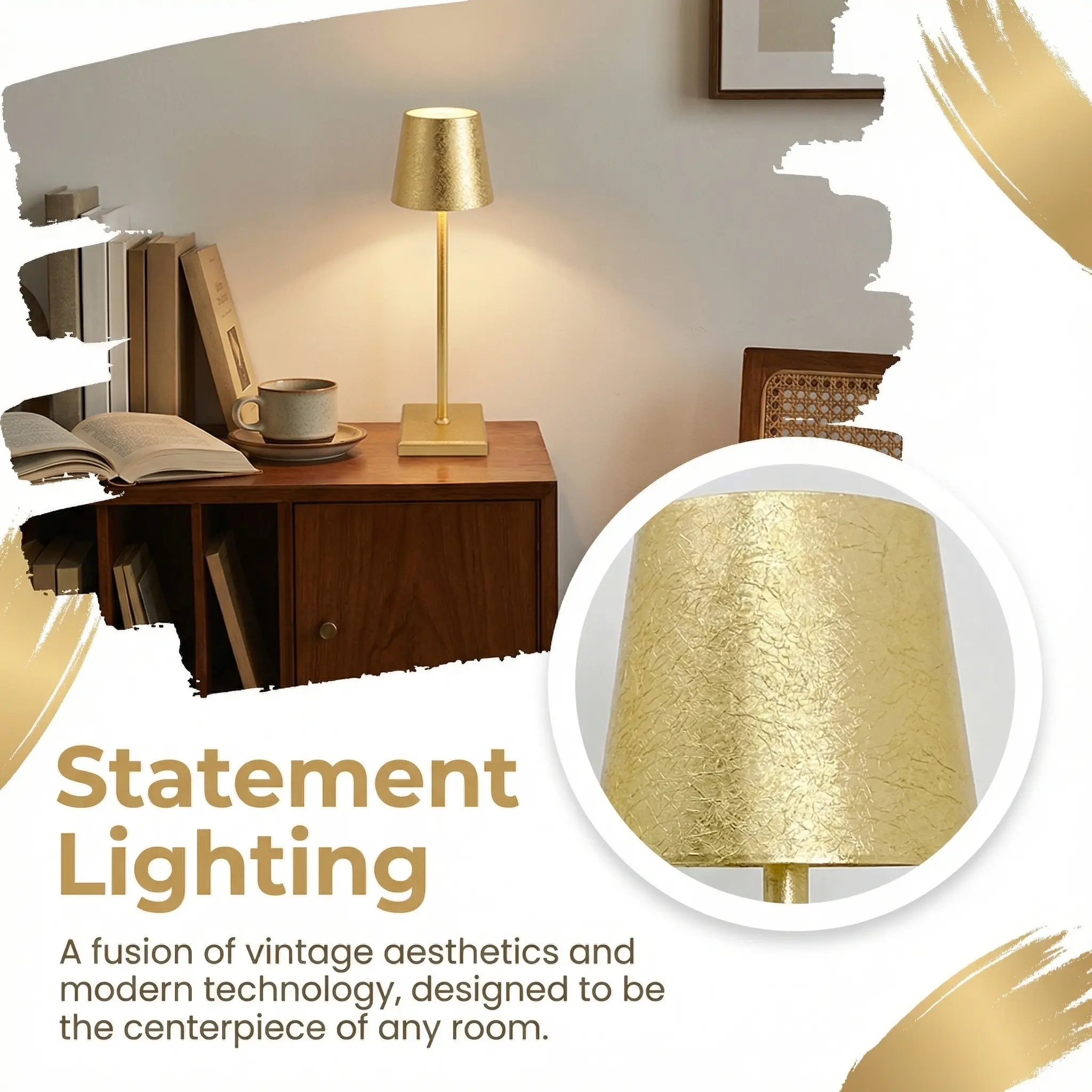 Add a warm, elegant glow to your space with this modern gold table lamp. Featuring a slim gold-tone body and a textured metallic shade, it creates a refined ambient lighting effect that feels cozy, stylish, and inviting. The warm light adds depth and atmosphere to tabletops, making it a beautiful choice for bedrooms, living rooms, restaurants, bars, and lounge-style spaces.