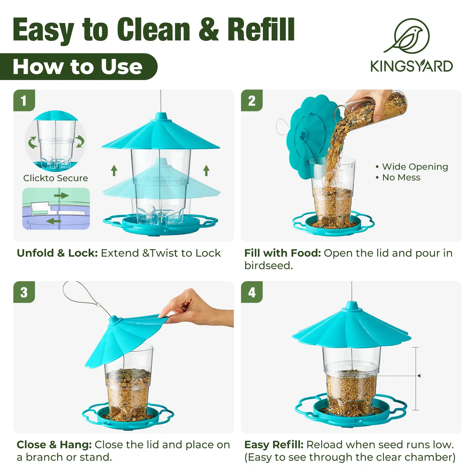 ·Holds 2.5 lbs. of Seed for Less Refilling – The large-capacity hopper minimizes your maintenance, allowing for extended feeding periods and making it ideal for frequent bird watchers or when you're away. Also available in a convenient 2-Pack for multi-location feeding.