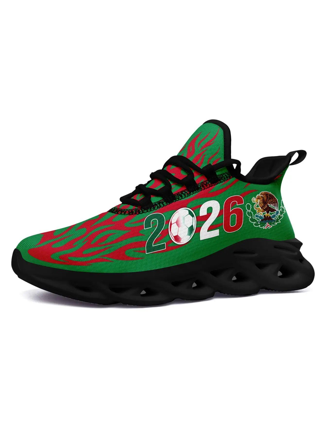 Men's Mexico 2026 Green Red Flame Soccer Eagle Print Sport Shoes, Wide Fit, Plus Size, Trendy Casual Sneakers for Daily Walking, Gym & Outdoor