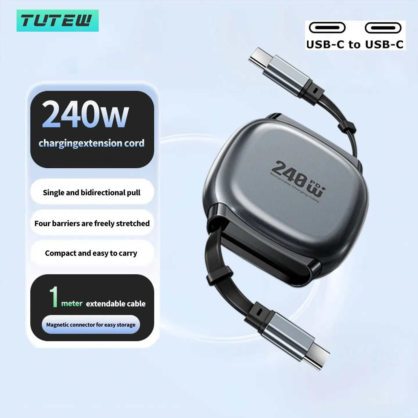 240w Retractable Fast Charging Cable USB C to C, Auto Coiling for Travel, Compatible with iPhone, Samsung, Huawei, Phone Tablet Laptop