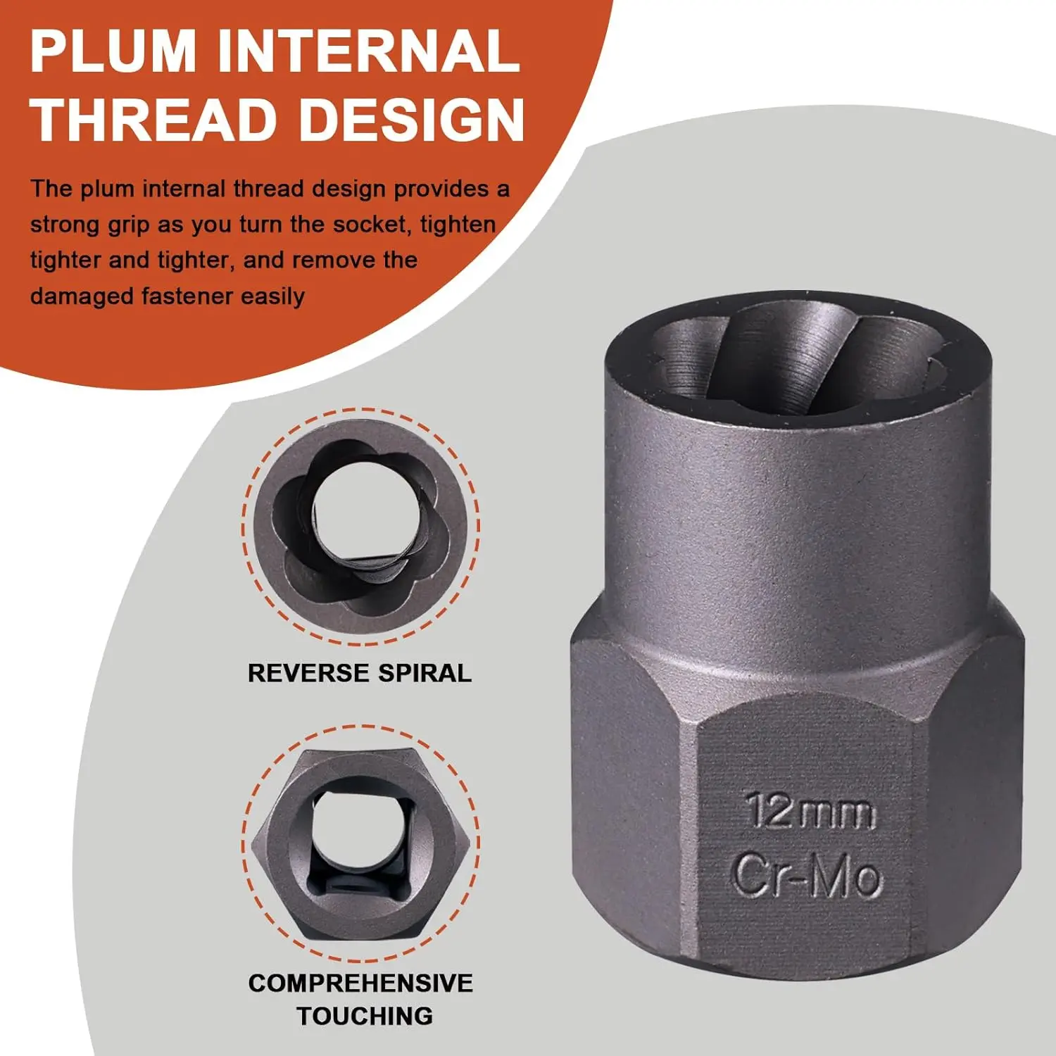 Featuring reverse spiral flutes that provide strong gripping power, it allows easy removal of rounded-off, rusted, or painted-over bolts using hand ratchets, impact wrenches, and air ratchets.