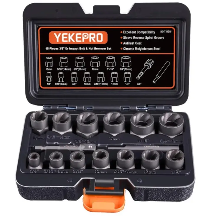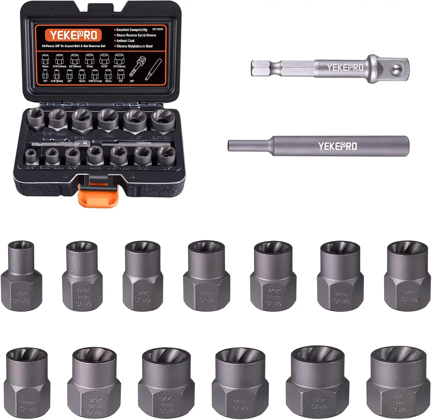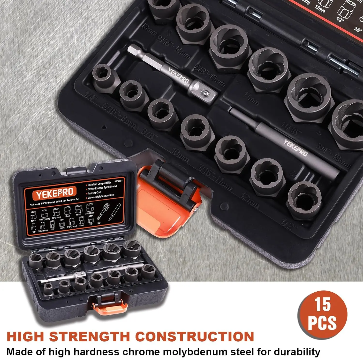 The 15-piece bolt extractor set includes sockets in multiple sizes ranging from 1/4" to 3/4" to fit various bolts and nuts.