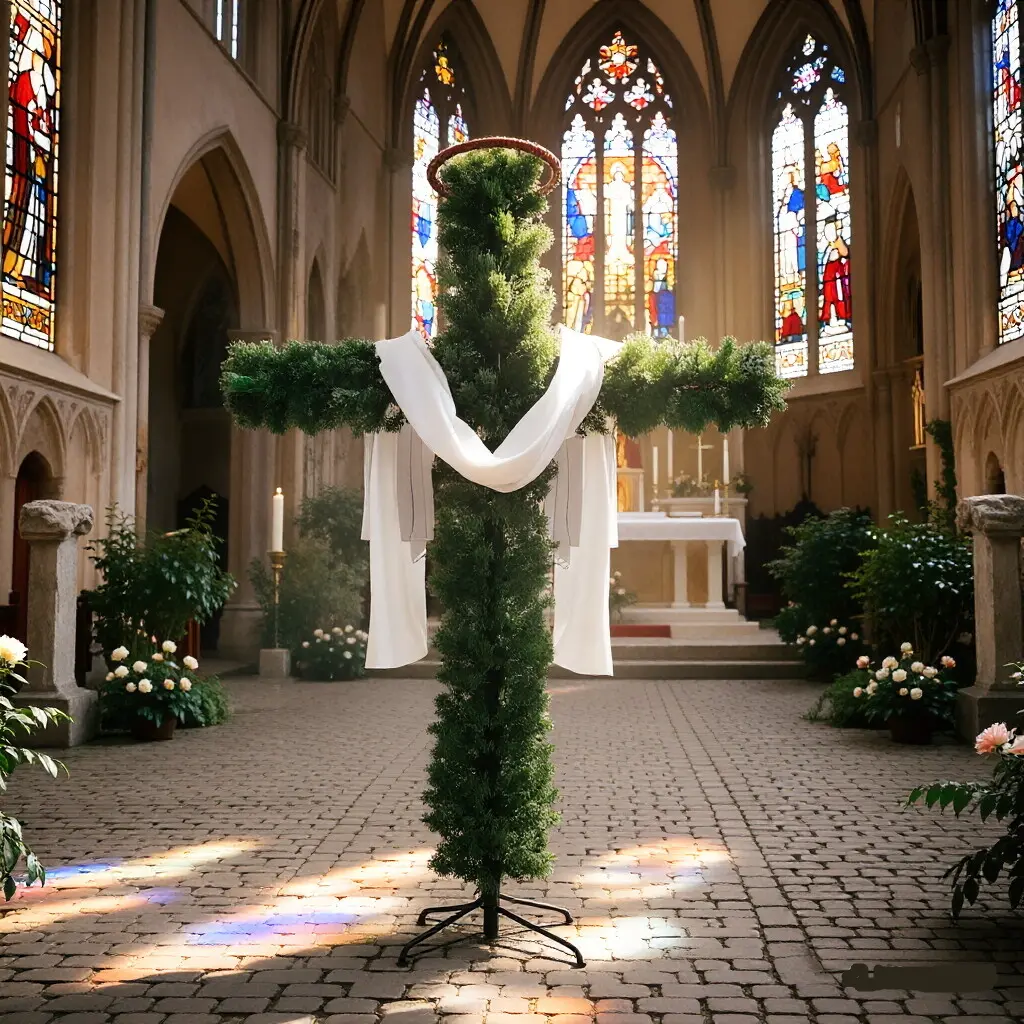Christmas, Halloween, Easter. A green cross Christmas tree, suitable for halls, outdoor and indoor spaces, churches, chapels, and other holiday decorations.