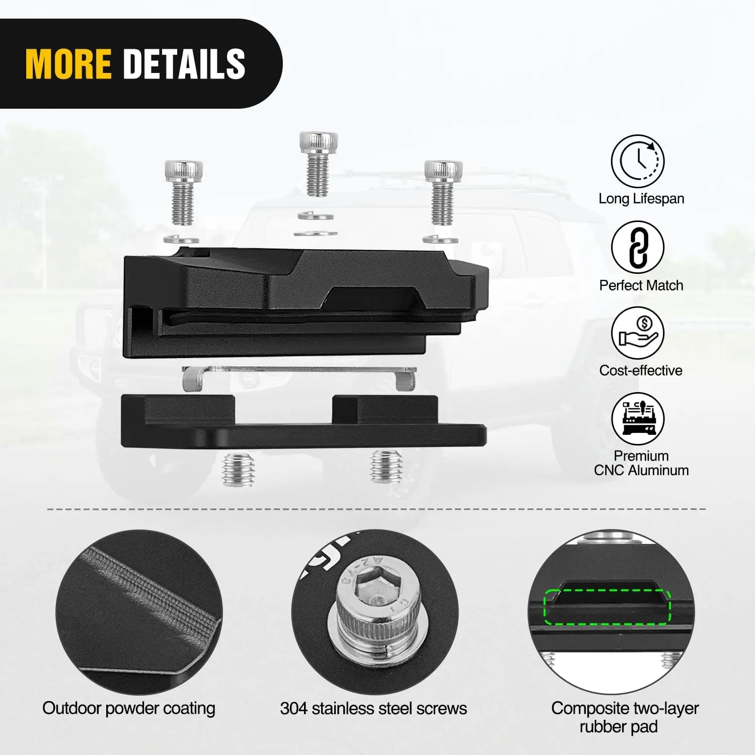 ·Anti-slip Design: The contact surface between the bracket and the hood is covered with a two-layer composite rubber pad, which is more non-slip and stable, and ensures that it will not damage the car paint