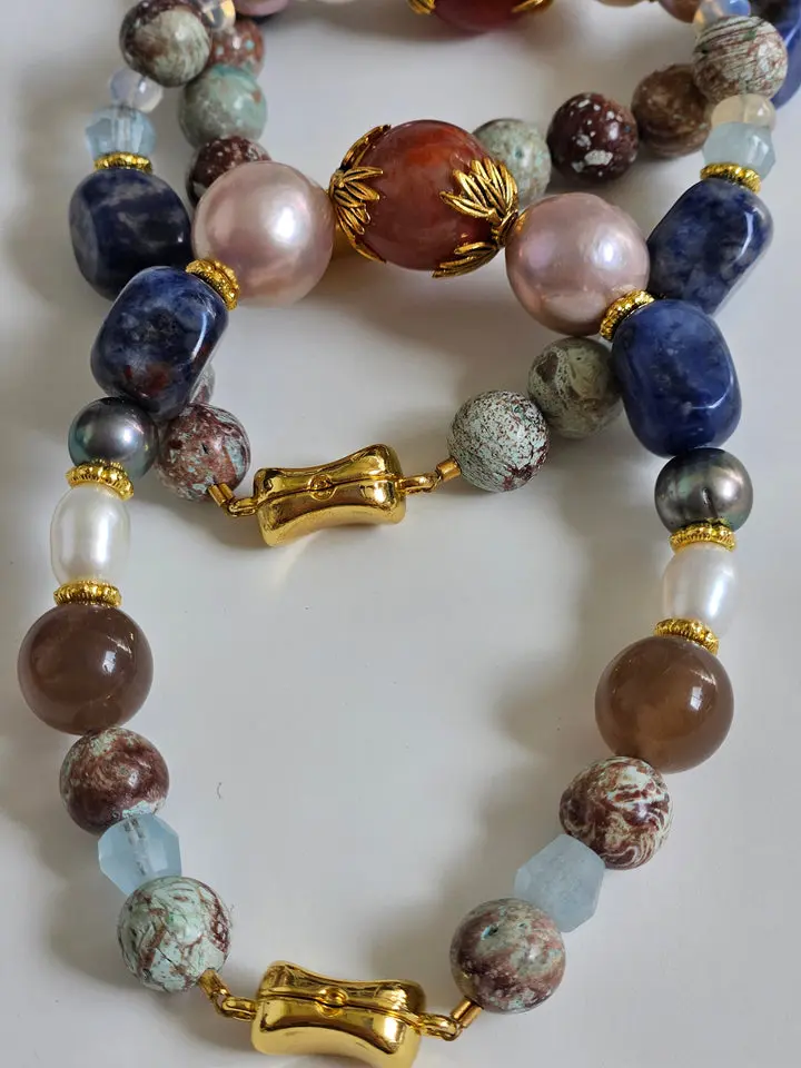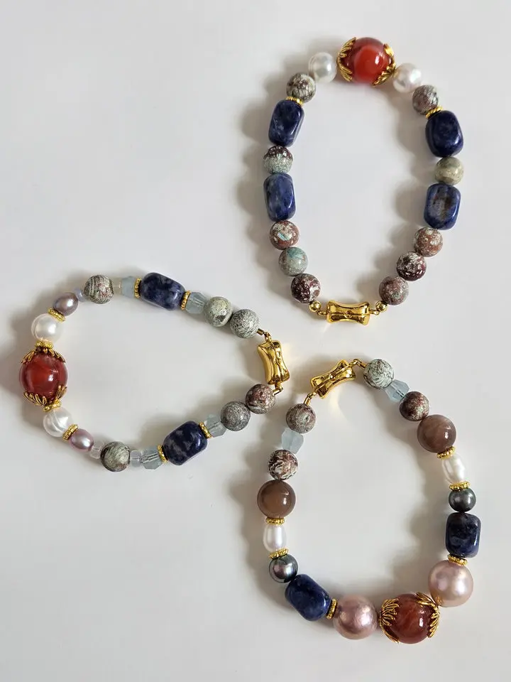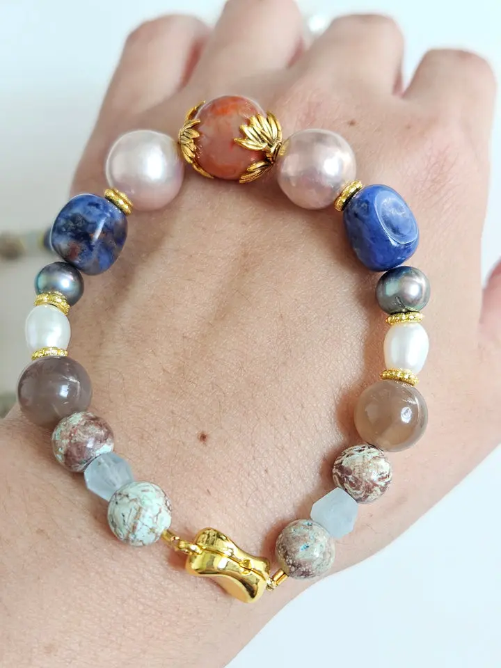Experience artisan craftsmanship in every detail. Each bracelet is meticulously handmade, showcasing the natural luster of freshwater pearls and the rich color of fine gemstones. The balance of textures — organic pearls, polished stones, and metallic gold highlights — creates a refined aesthetic that complements any outfit from casual chic to evening elegance.