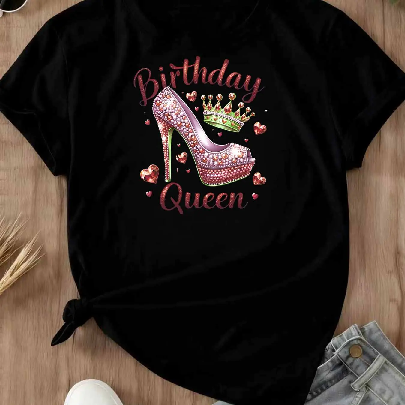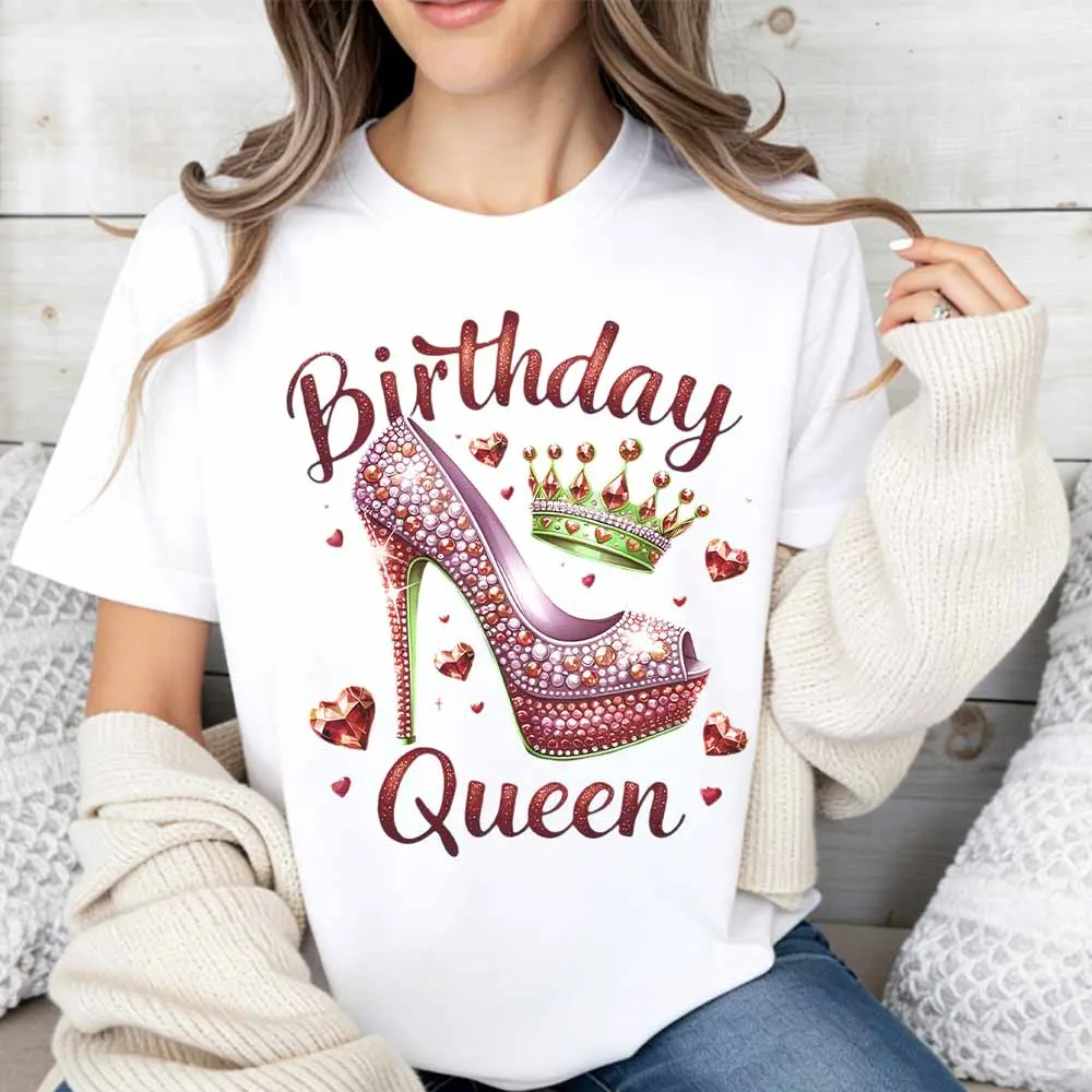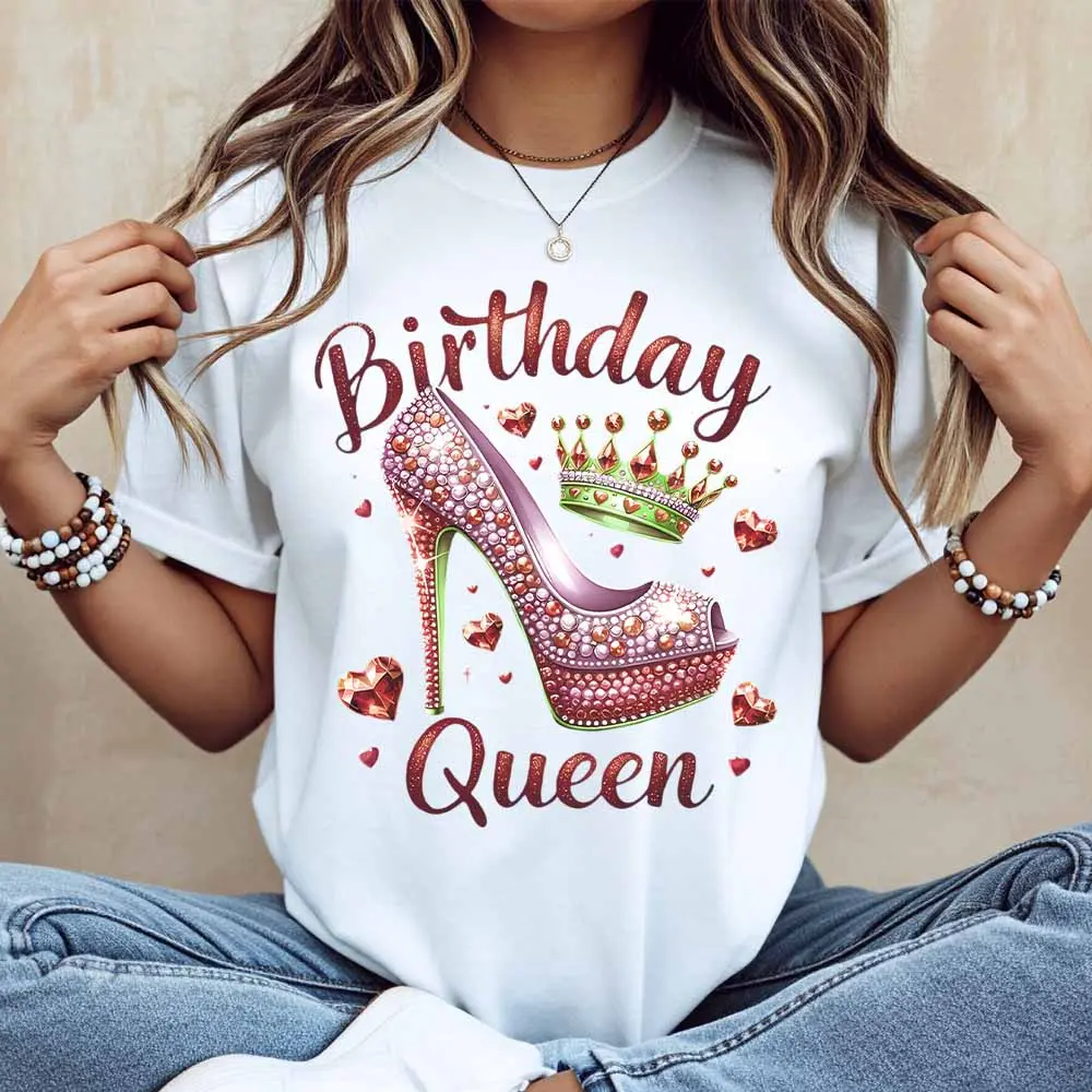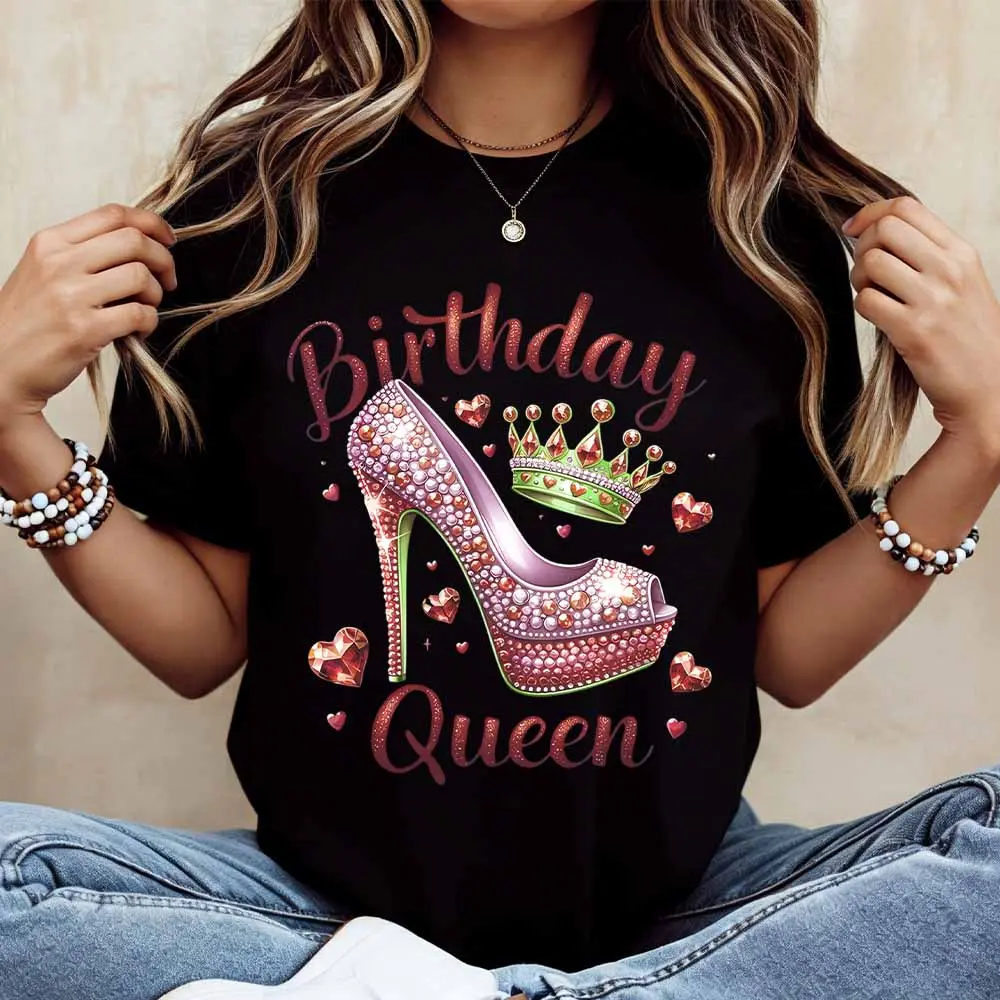 Birthday Queen High Heel Crown Print T Shirt Casual Loose Fit For Everyday Wear And Leisure Activities
