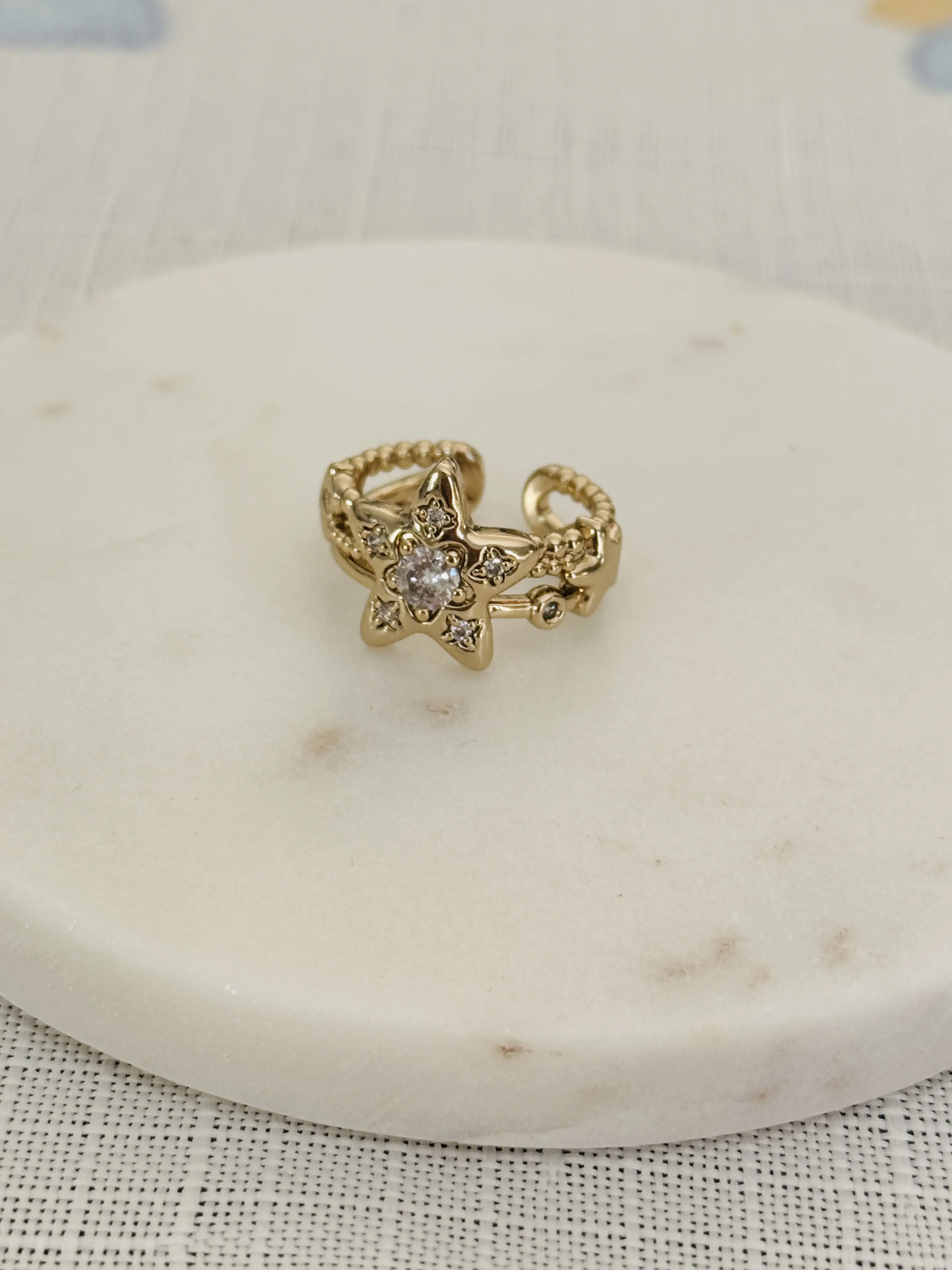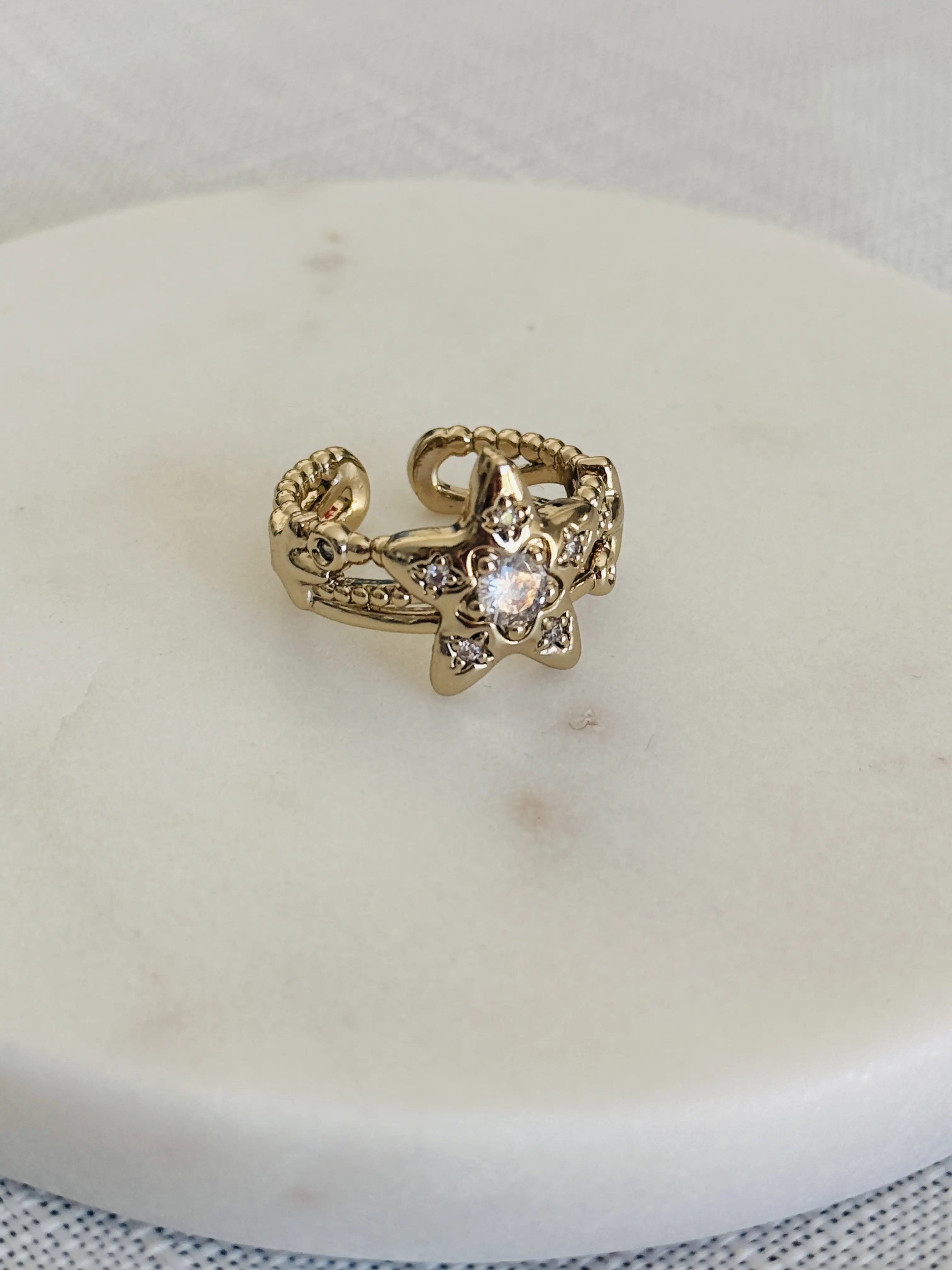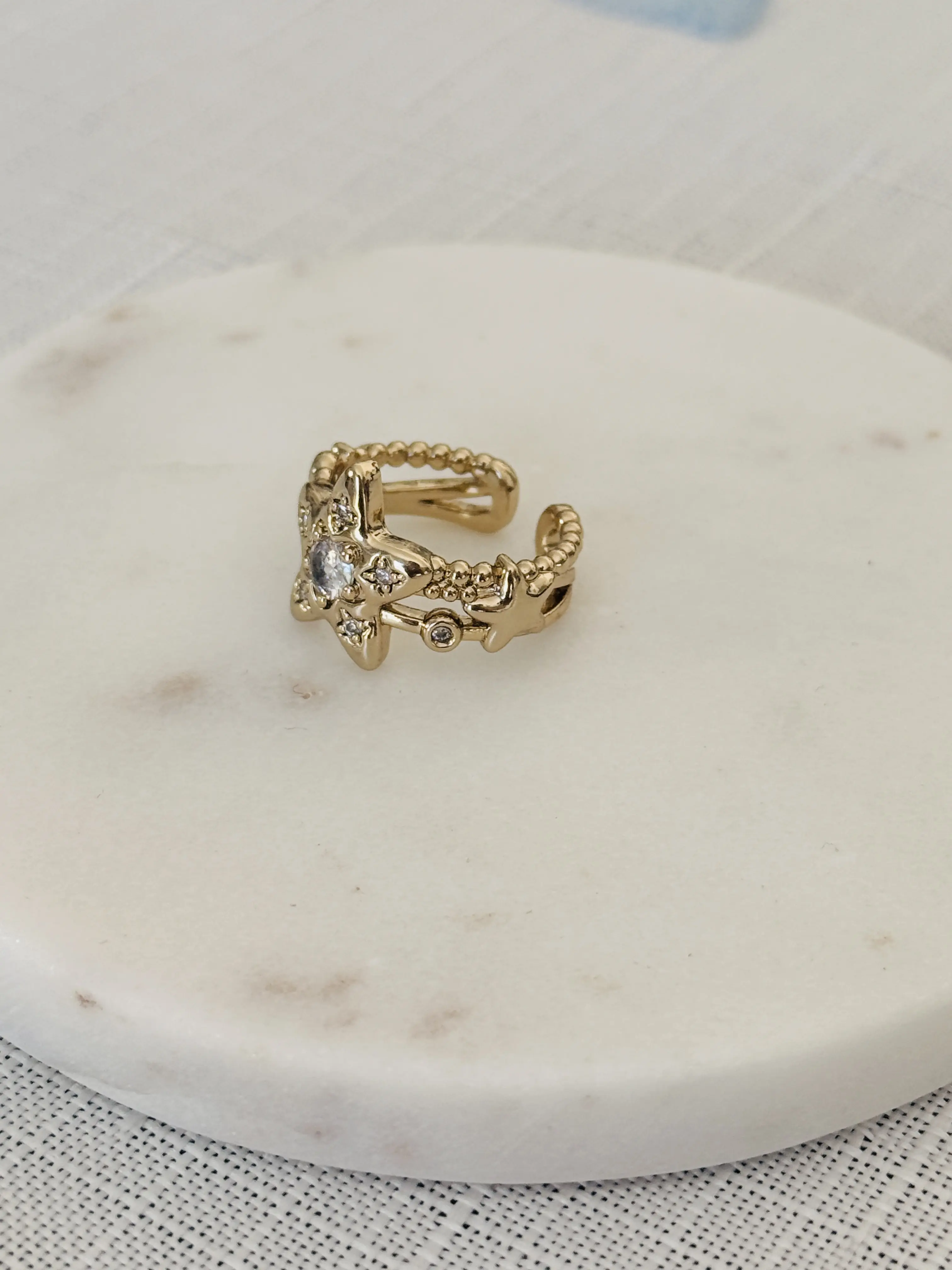 Centered on a double-layer starburst design, the main star is set with a lustrous round center stone, accented by sparkling melee diamonds along its edges. The secondary star and beaded chain band interweave in perfect harmony, as if you’re wearing the entire starry sky on your fingertips—delicate, dynamic, and utterly dreamy.