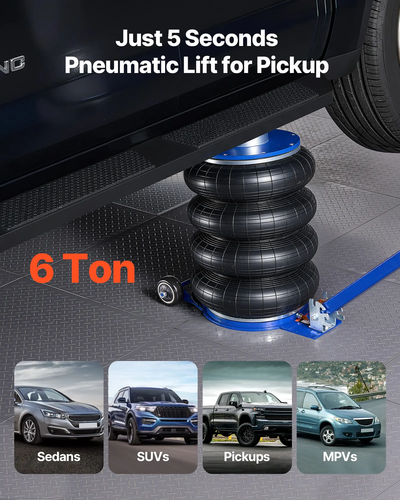 6-Ton Heavy Load Capacity: This airbag jack supports up to 6 tons/13227 lbs, suitable for sedans, SUVs, pickups, and trucks. Its reinforced four-layer airbag and widened base plate ensure strong, stable lifting performance