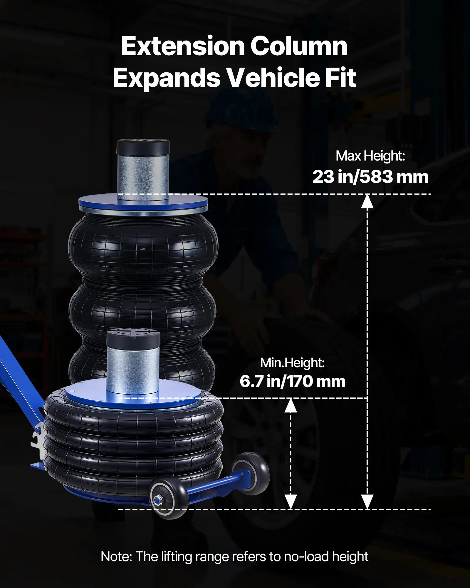 Fits More Vehicles: This air jack includes an extra extension column. Without the column, it lifts 6.7-23 in (170-583 mm); with the column, 10.2-26.5 in (260-673 mm). One jack fits both low-profile cars and high-clearance SUVs or pickups