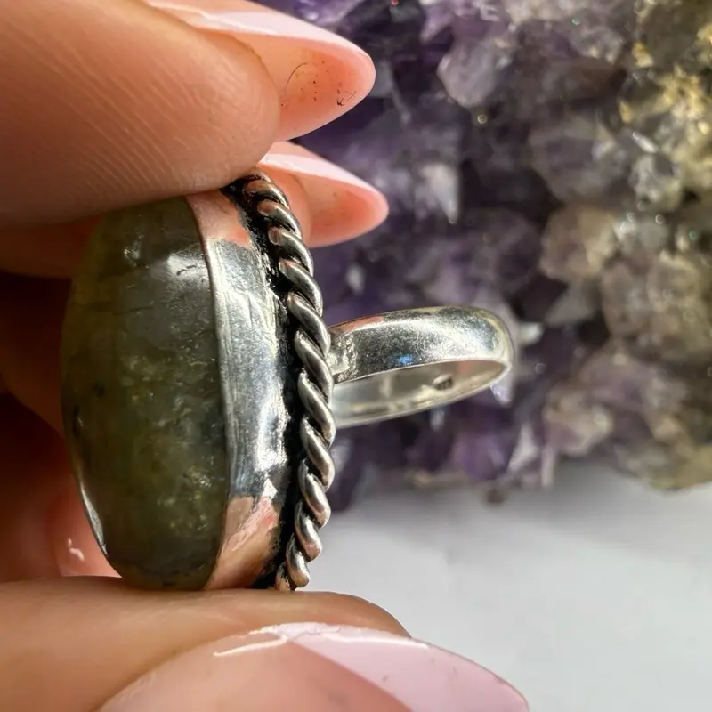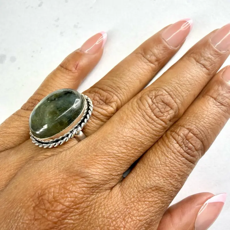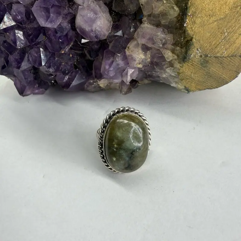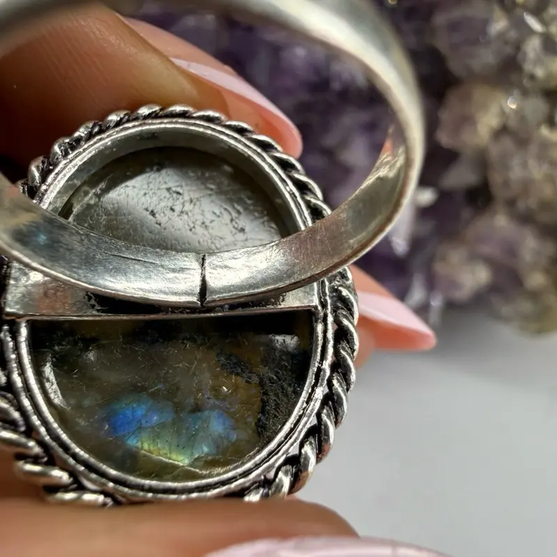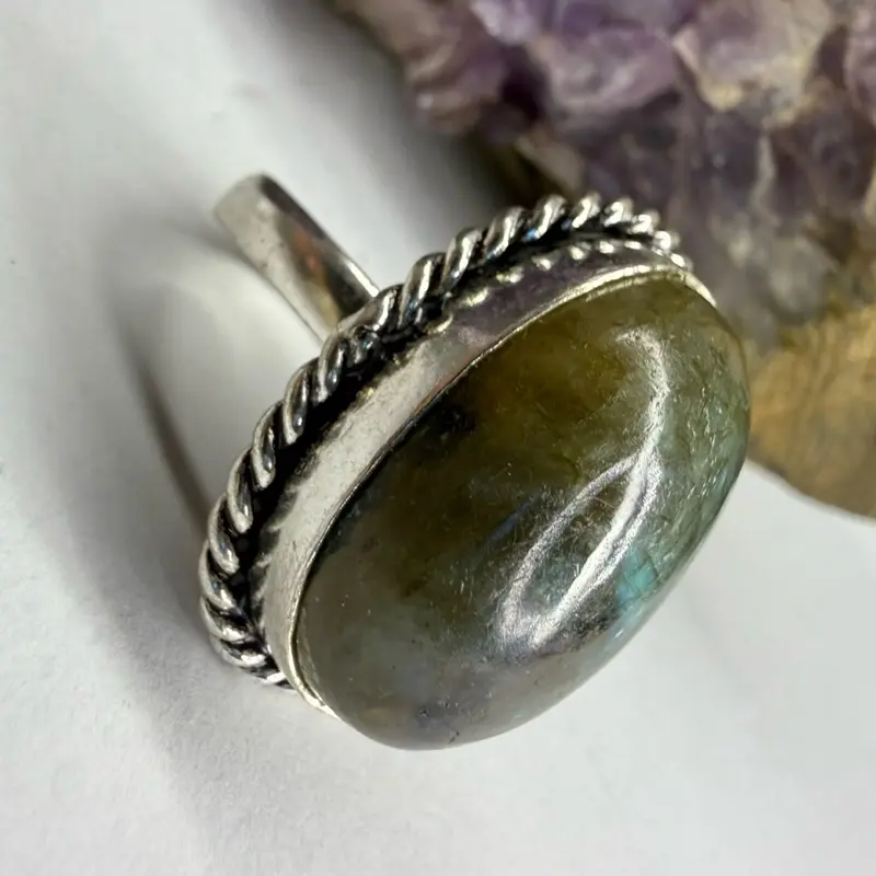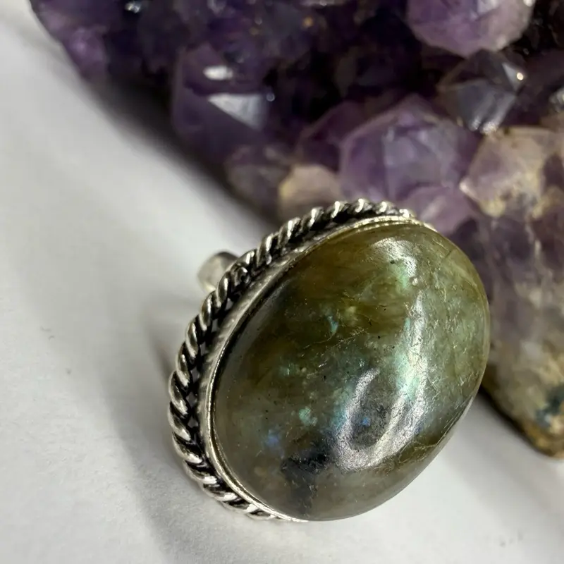Glimmering Labradorite Gem**: Displays mesmerizing rainbow flashes of color as light dances across the surface. Each stone is one-of-a-kind, giving your ring true individuality.