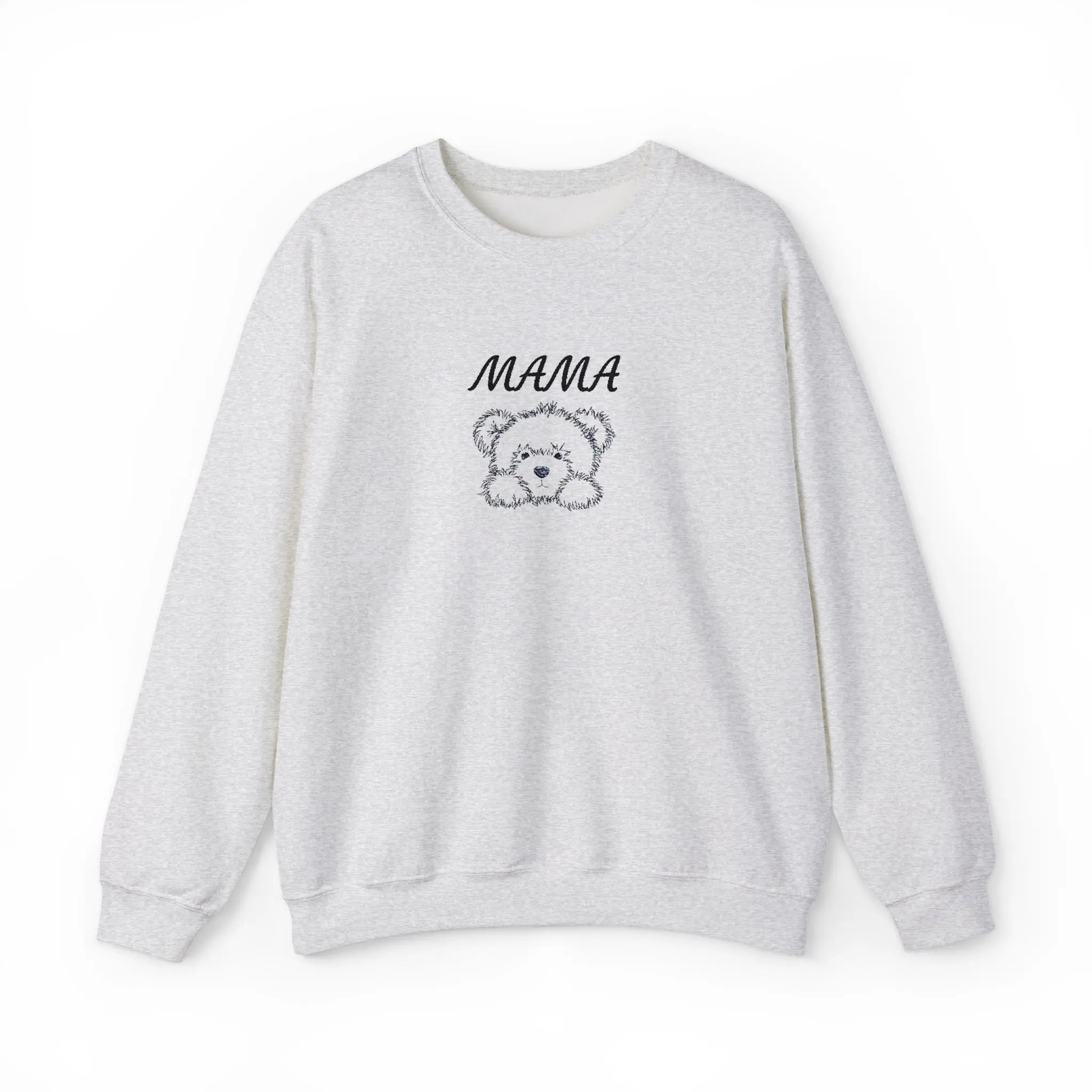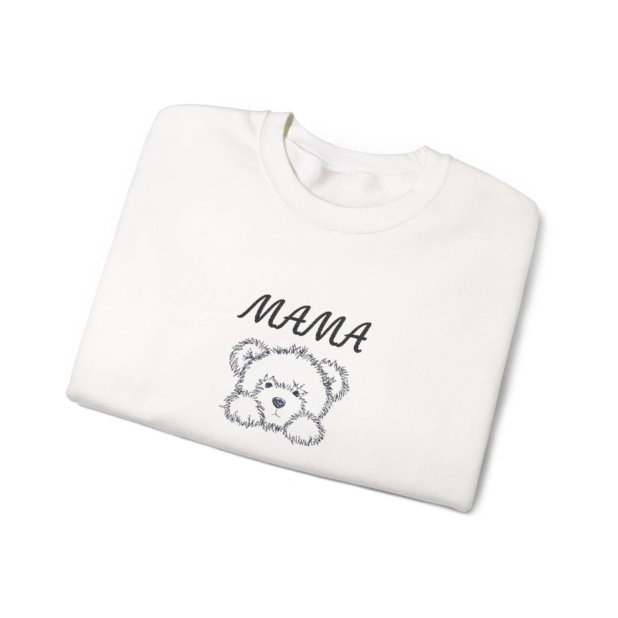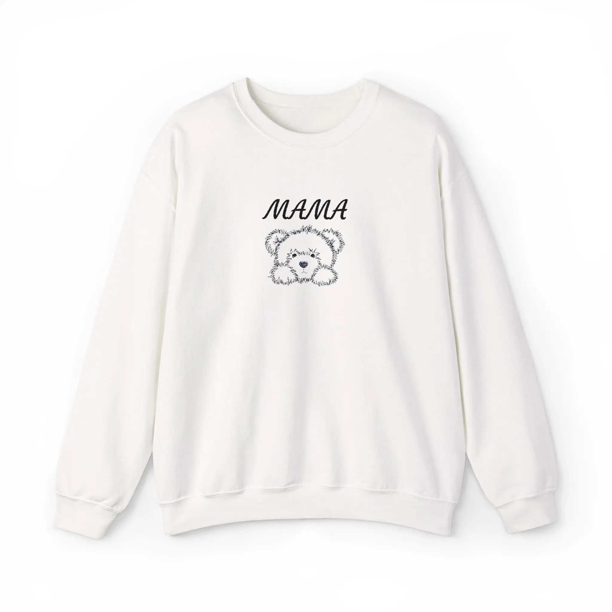 Looking for the perfect gift for Mothers day? Enjoy this soft, lived-in comfort meets gentle charm. This crewneck sweatshirt features a delicate embroidered sketch of a fluffy bear beneath the hand-lettered word “MAMA,” placed on the center chest for a subtle, personal touch. The fabric has a cozy medium-heavy weight that drapes comfortably while holding its shape, and the ribbed collar and cuffs give a clean, familiar silhouette. Wear it on slow mornings with coffee, layered for brisk park walks with little ones, or as your go-to cozy piece when you want something that feels like a hug. The understated white color keeps the design light and approachable, while quality stitching and ethically sourced cotton mean this sweatshirt is built to be part of everyday life rather than a fleeting trend.
