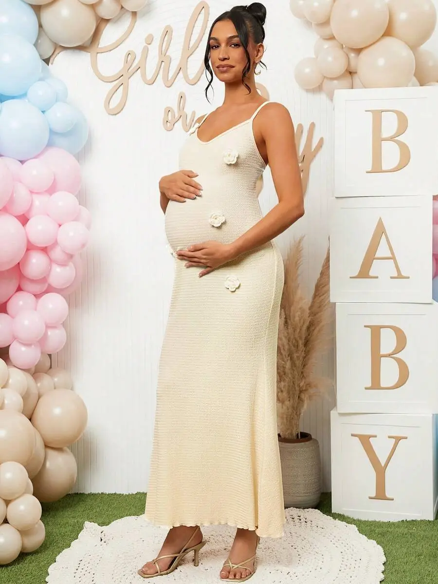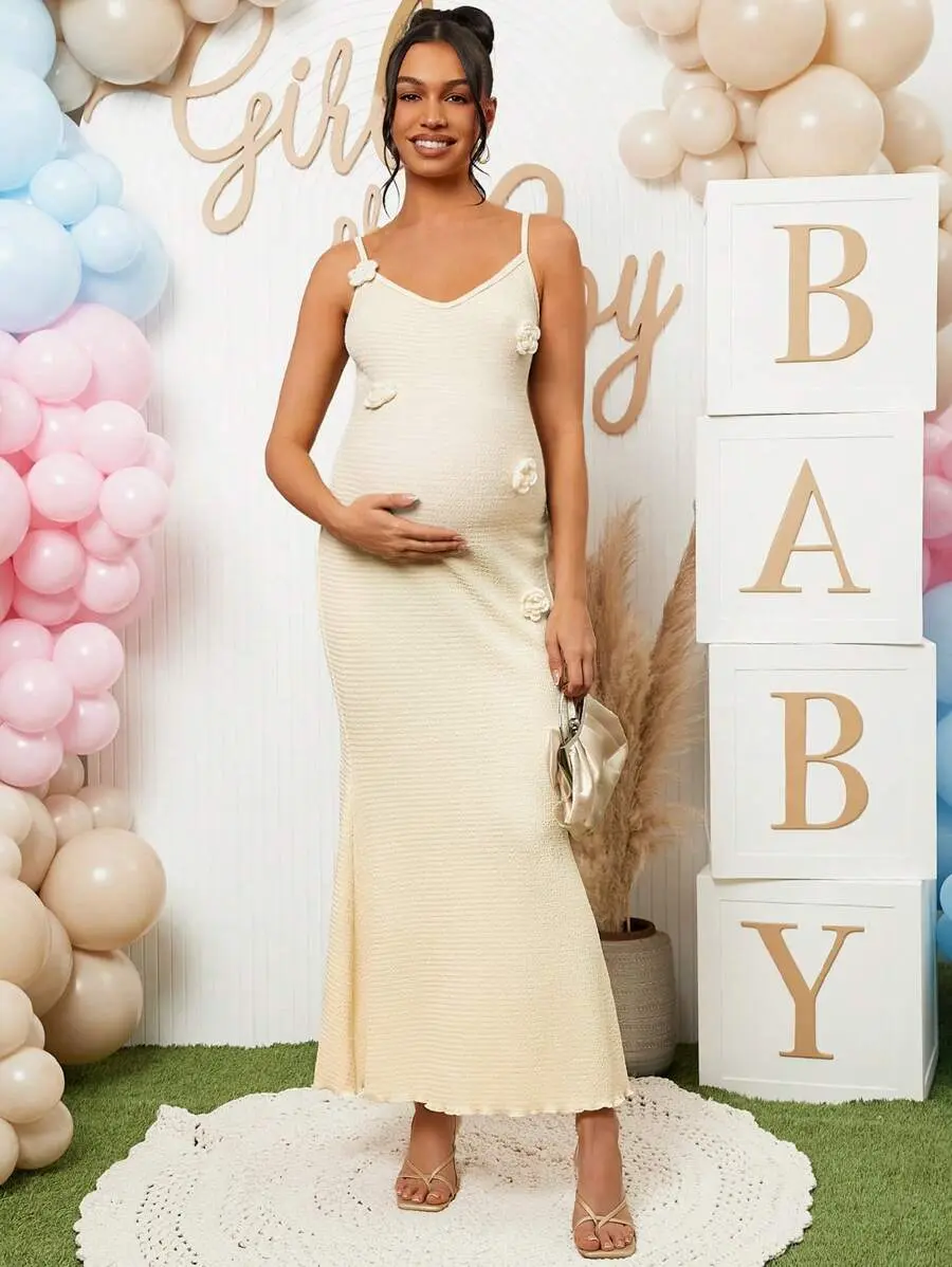 TAMALLA Pregnant Women Elegant Solid Color 3D Floral Decor Strap Dress, For Baby Shower Party,Gender Reveal Dress,Maternity Dress