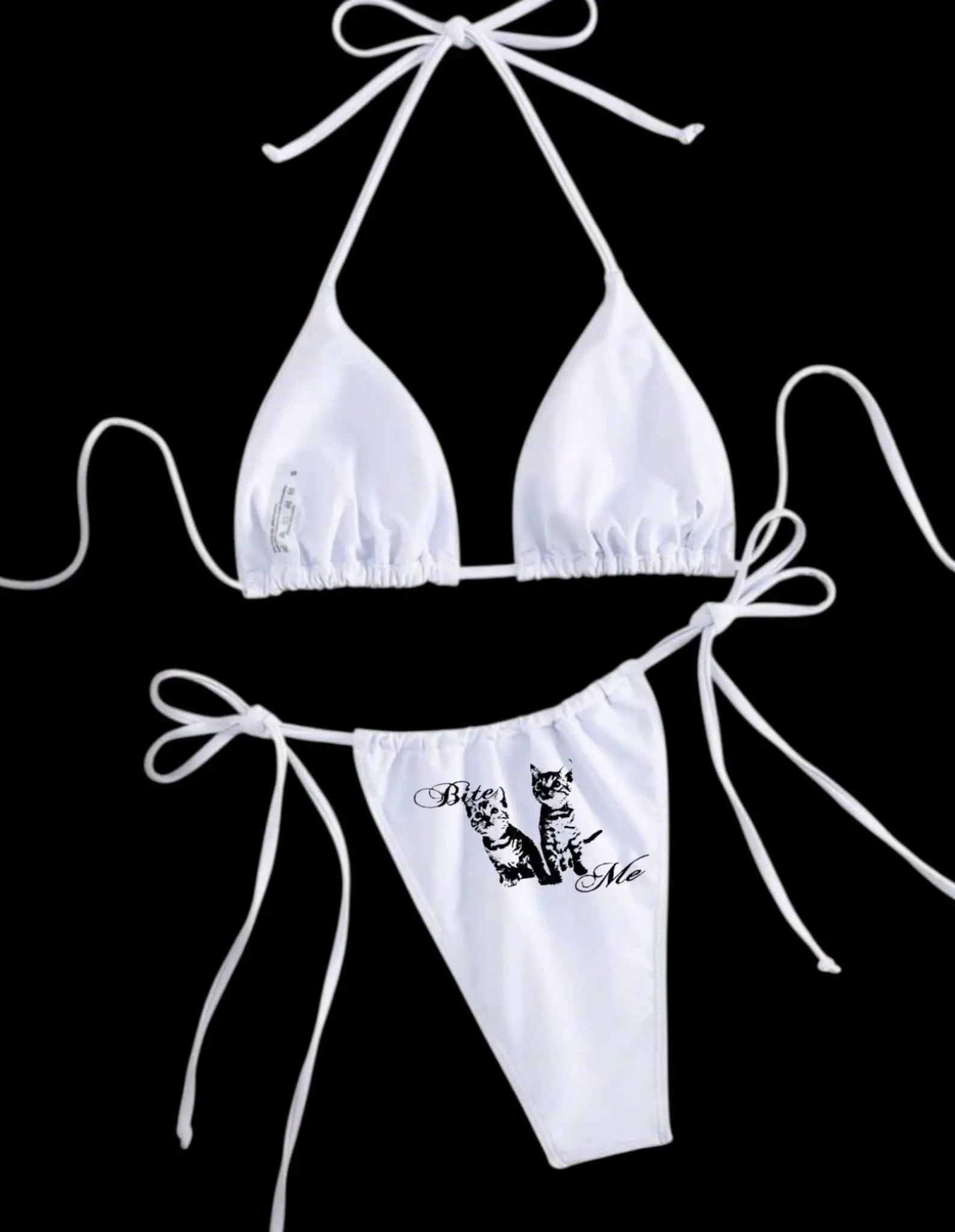 Bite Me Cat Bikini – White Triangle Bikini with Black Kitten Print | Edgy Y2K Swimwear