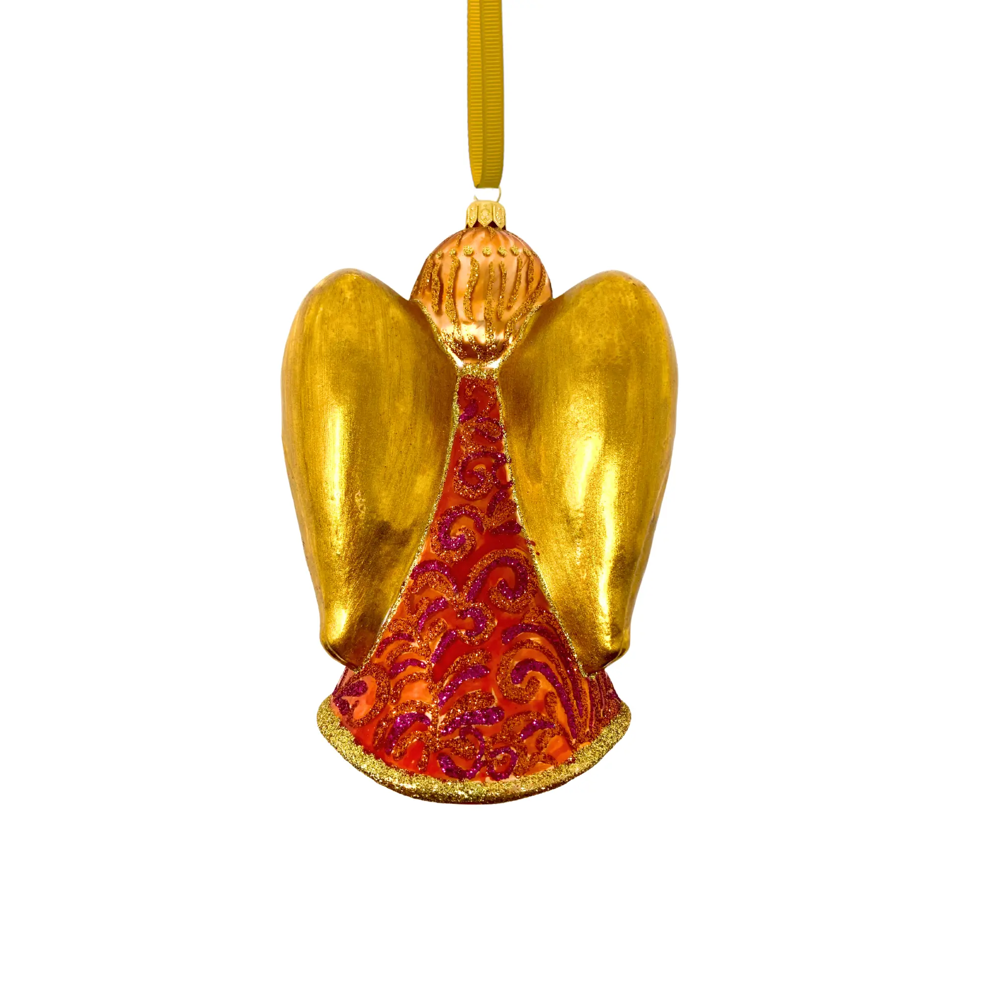 She holds a glowing reflector like a captured ember, framed by gilded wings and a gown washed in warm sunset tones. The palette leans golden, coral, and rose, layered in delicate scrollwork that shimmers with movement. Graceful and composed, she brings a soft glow to the tree without ever raising her voice. A moment of calm, styled in light.