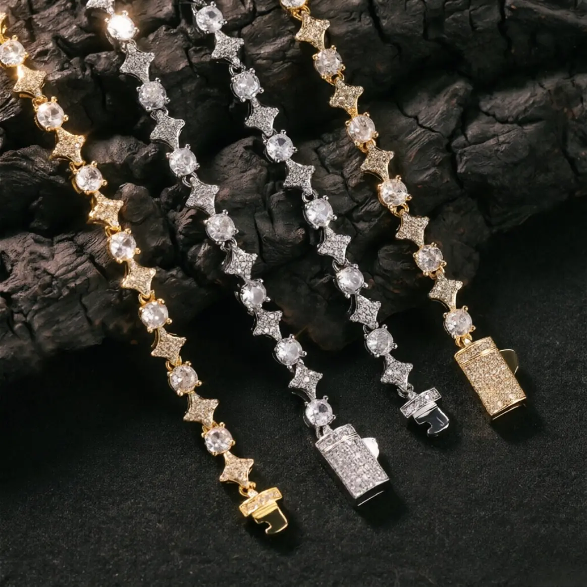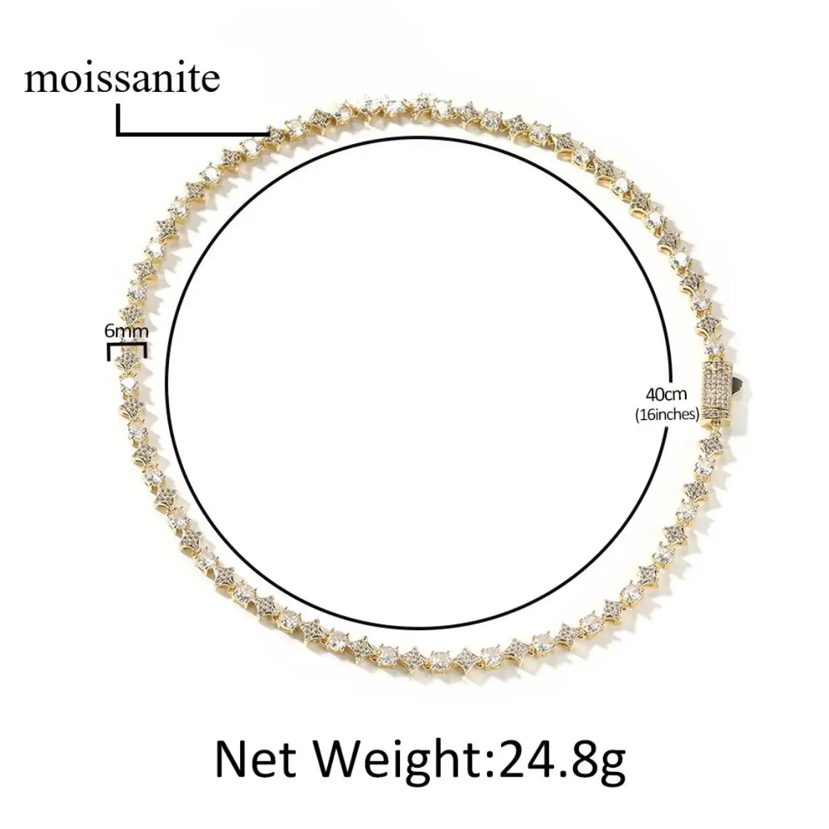 This moissanite tennis chain necklace and bracelet features a four-pointed star design and round cut, showcasing a strong hip-hop style and a sophisticated luster. The high-quality moissanite rivals the brilliance of diamonds, making it dazzling and eye-catching. Suitable for everyday wear or party looks, it's unisex and an ideal gift or personal item.