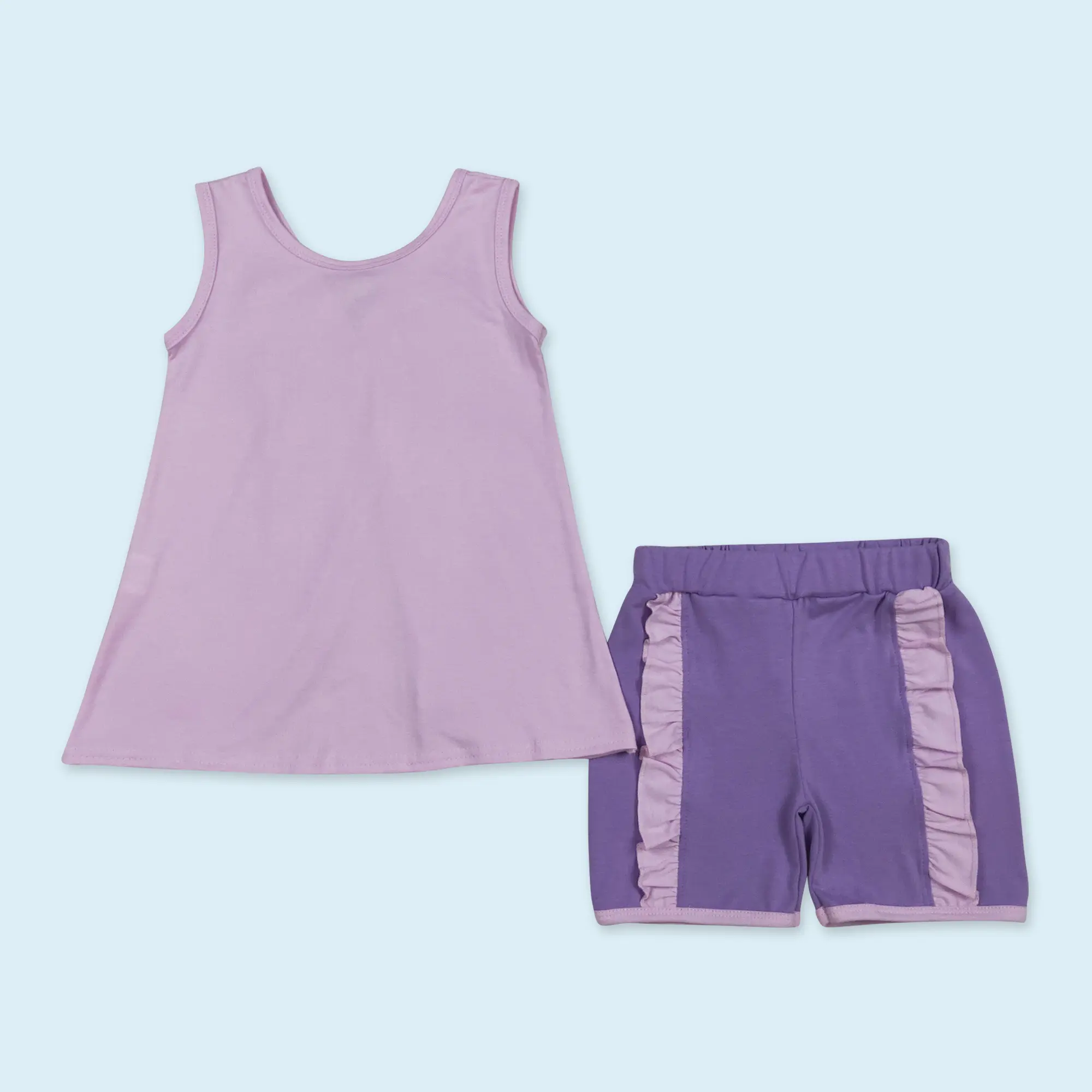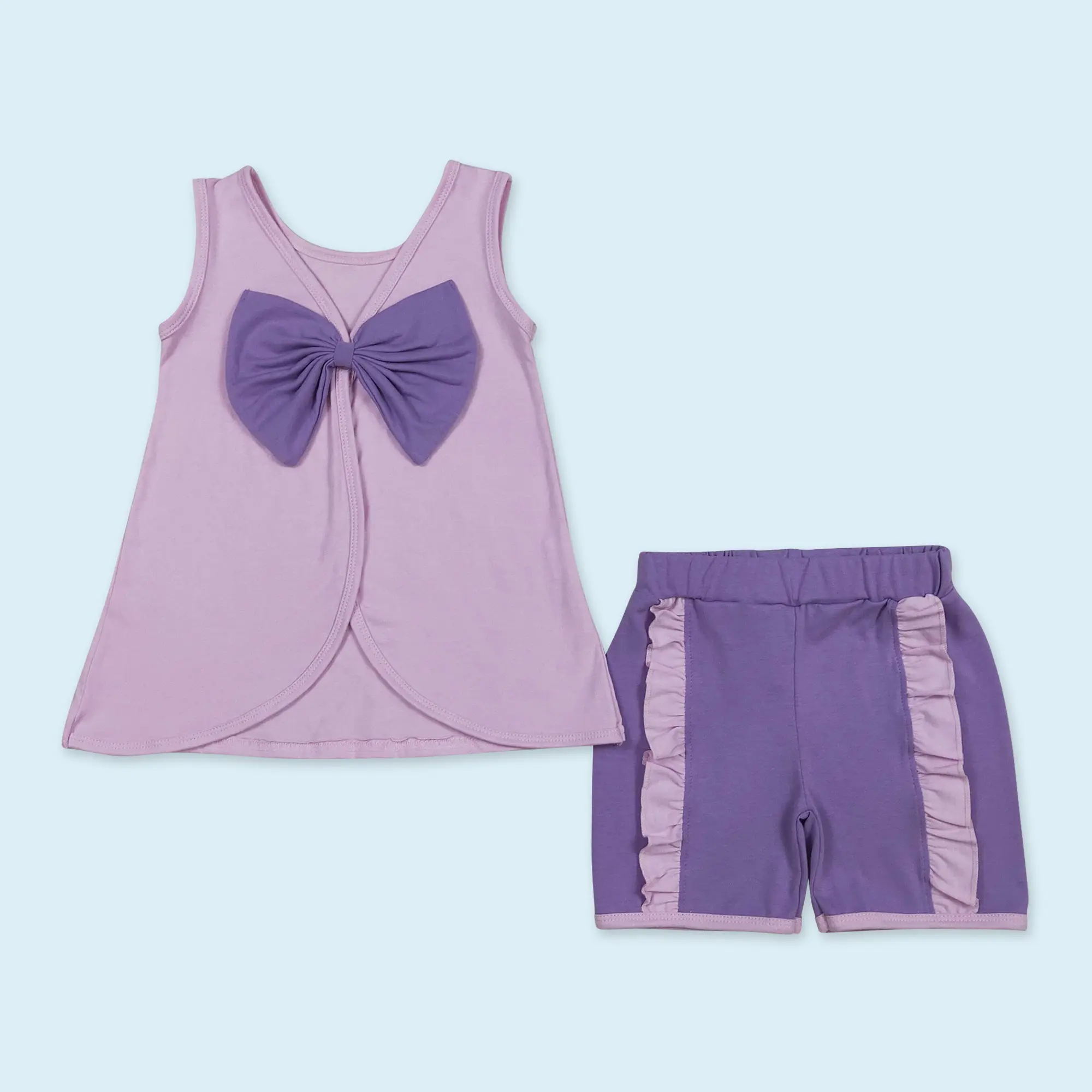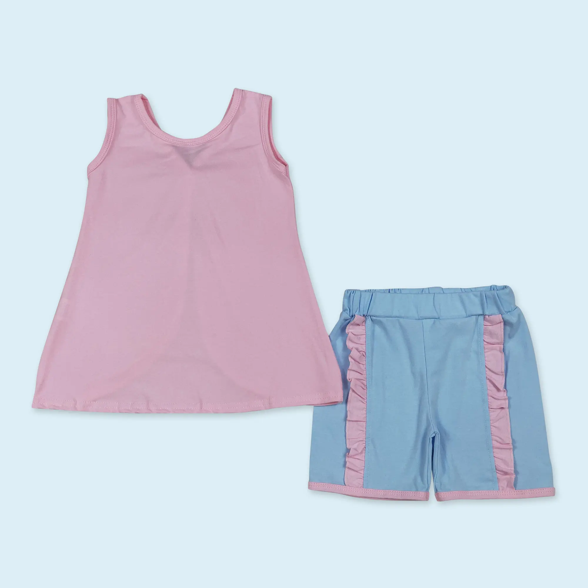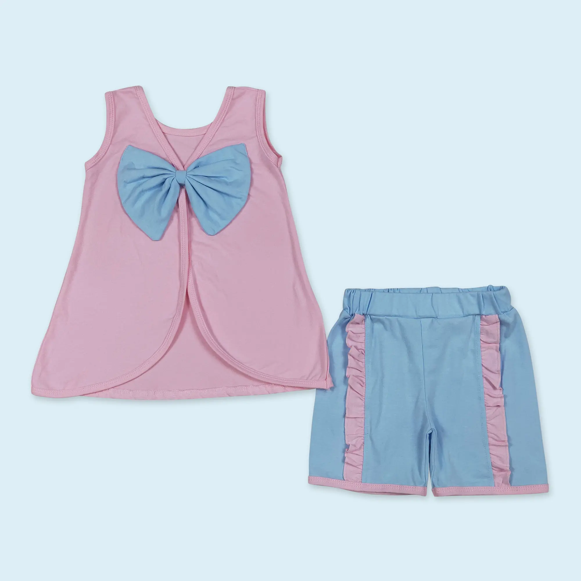 Sleeveless bow pink tunic light blue shorts girls summer outfits kids summer boutique clothes