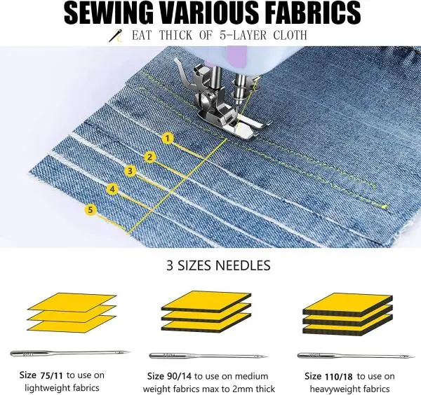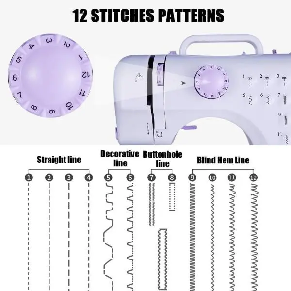 Multiple Stitch Patterns: This mini sewing machine offers a variety of stitch patterns, including straight stitch, zigzag stitch, and more. The stitch selection dial allows you to easily choose the desired stitch type for your project.