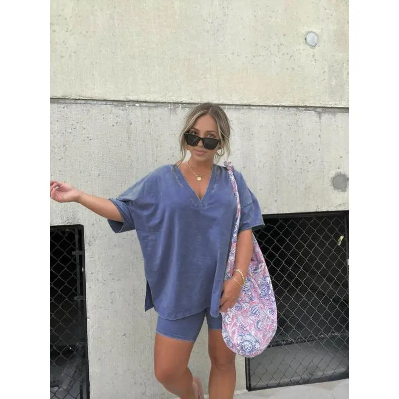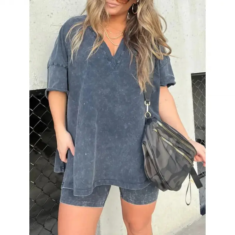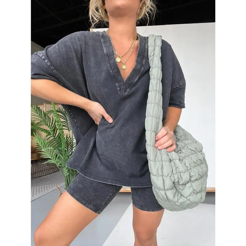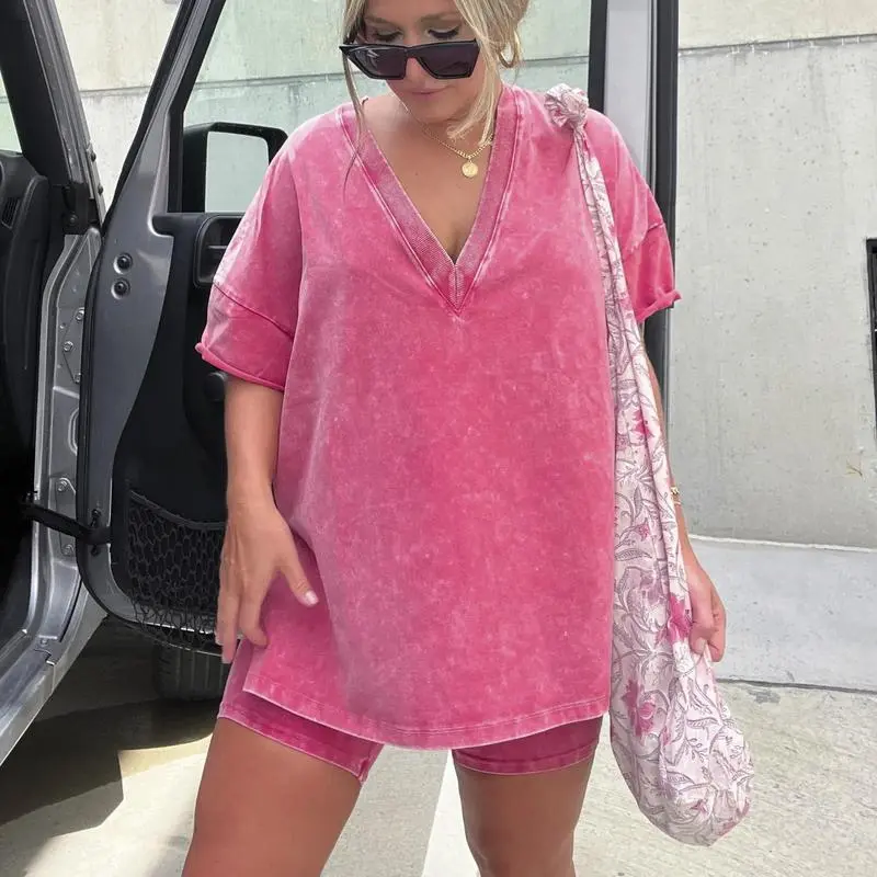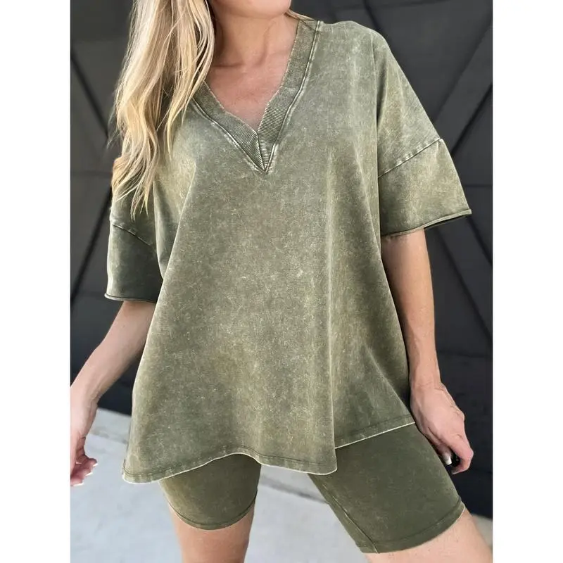 Women Washed 2 Piece Set Lounge Set Oversized Tops Biker Shorts V Neck Drop Shoulder Comfy Casual Clothing Basic Womenswear Suits Overalls pjs loungewear loosewearGift
